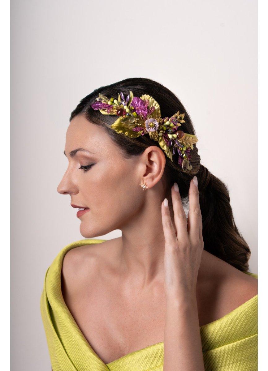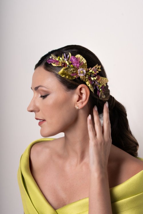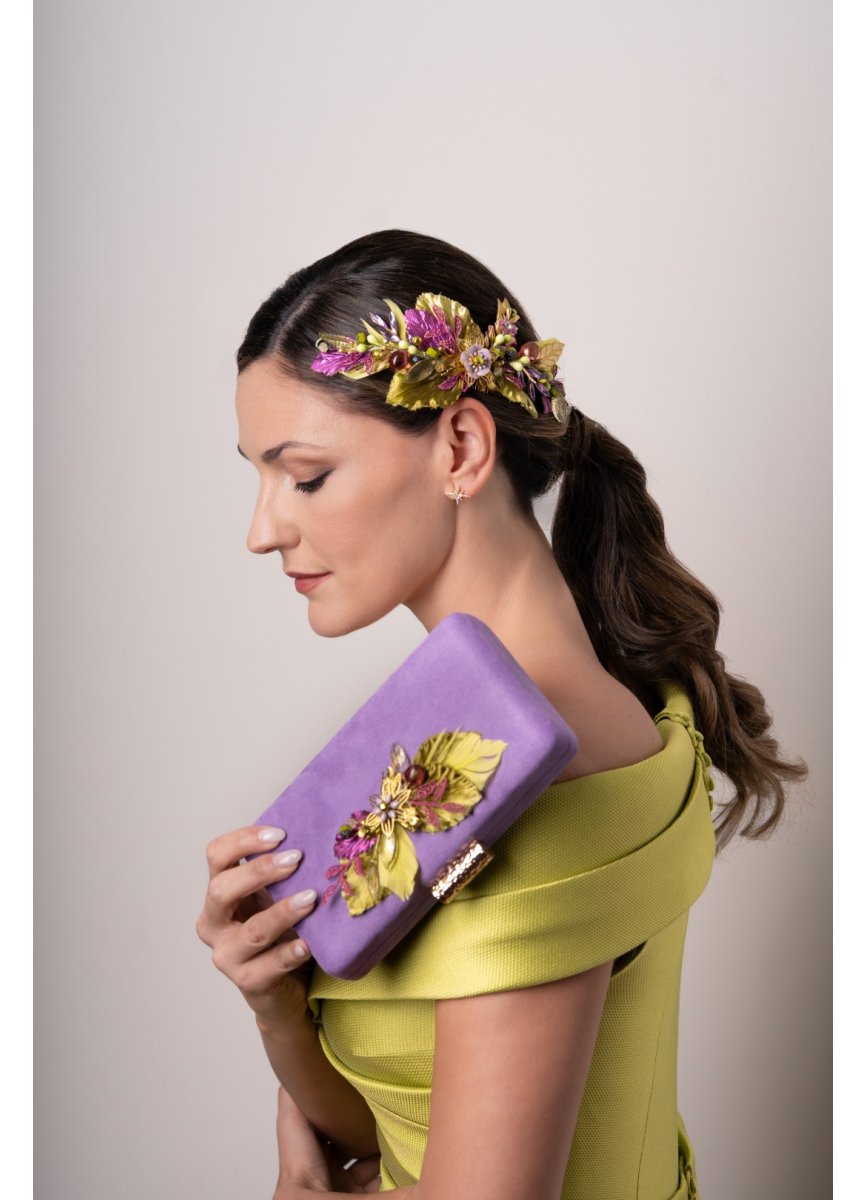 Tocado tipo joya joya en tonos verde lima y morado. Realizado de pistilos variados, hojas de metal, flor central esmaltada, todo envuelto en hojas de tela y un toque de plumas anade. Med. 22cm. Aprox.