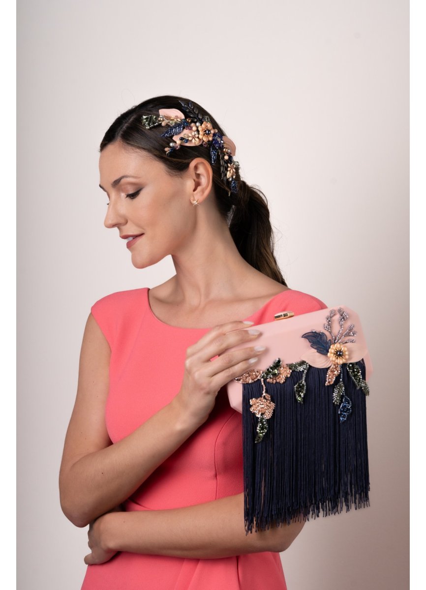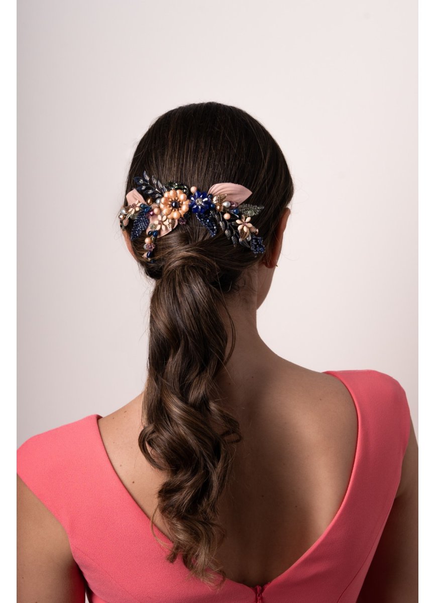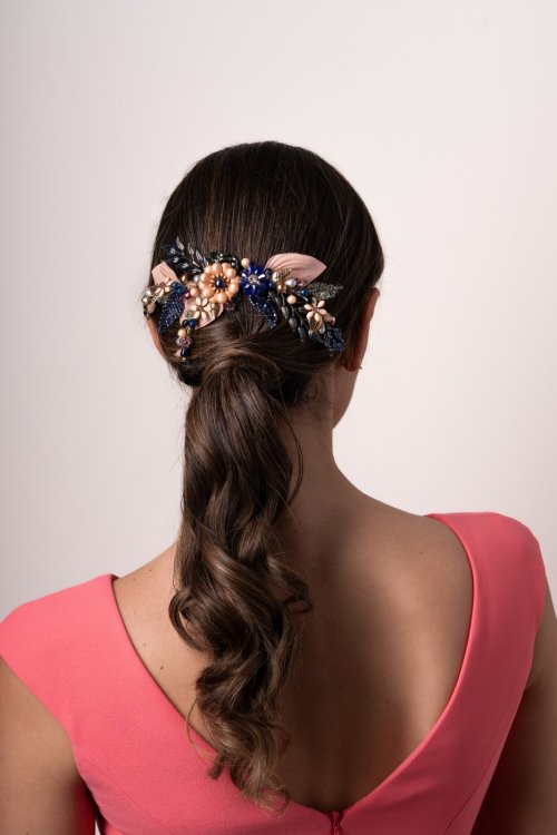 Tocado tipo joya joya en tonos nude, verdes y azulados. Compuesto por hojas de piel y metal, flores esmaltadas, acompañadas por pistilos y brillos enriquecido con hojas de encaje. Med. 21cm. Aprox.