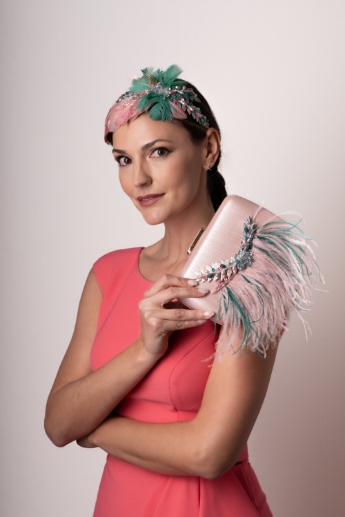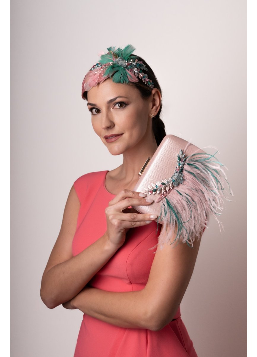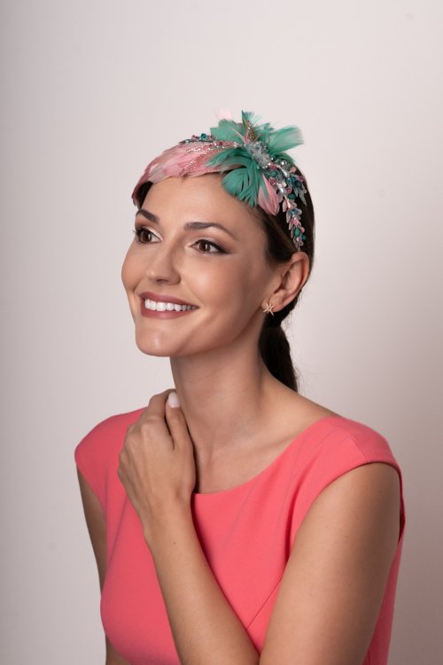 Diadema con base de lágrima en tono rosa y turquesa. La base está forrada en plumas anade rosadas y encaje de pedrería a juego. Para decorar la diadema pistilos, brillos y hojas de metal teñidas. Med. 32cm. X10cm. Aprox.