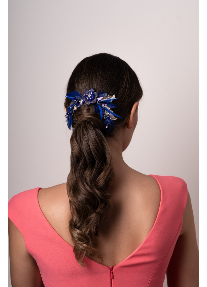 Tocado tipo joya coletero, medialuna en tonos azulina y plata. Las plumas son las protagonistas de esta creación, acompañadas de piezas de metal, pistilos y brillos. Flor central de cristales dan un toque de luz a la pieza. Med. 20cm. Aprox.