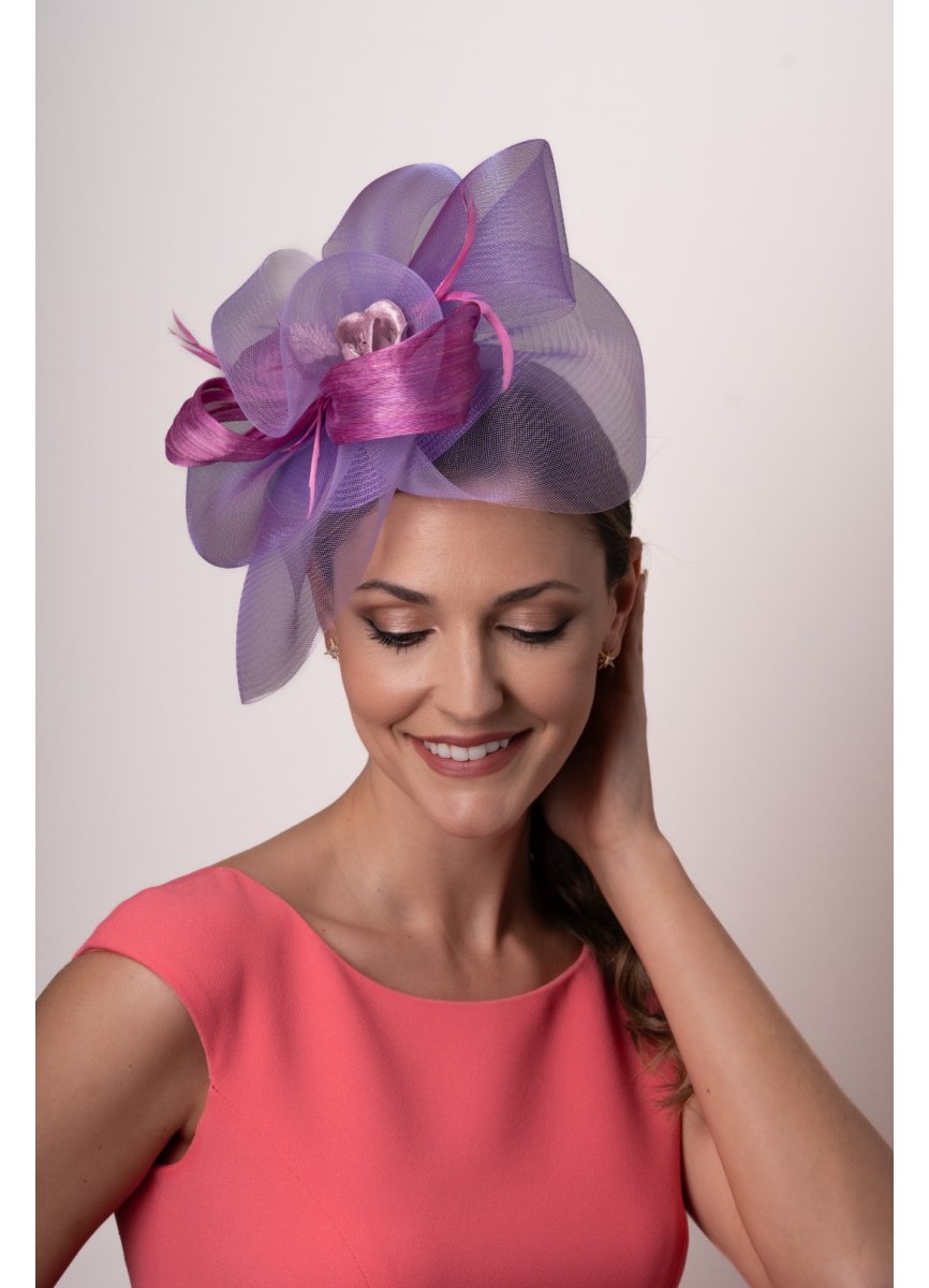 Tocado tipo joya de crin morado y sinamay seda buganvilla. Base de 14cm. Sintetica. Adornando el tocado unas flores en tono rosa nude de terciopelo y unas plumas biot dan el toque final. Peina para la sujección. Med. 33cm. X28cm. Aprox.