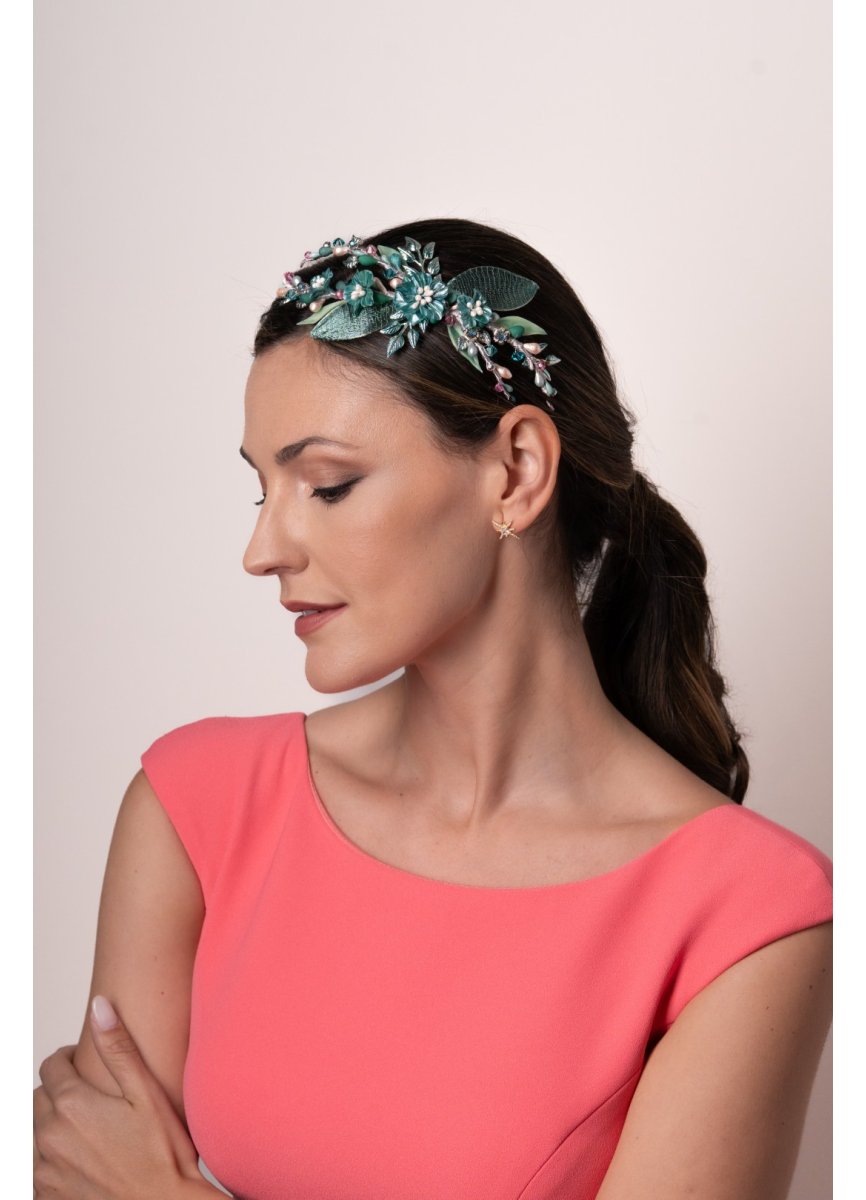 Tocado tipo joya joya en tonos turquesa y toque de rosa. Compuesto por cuatro flores de porcelana hechas a mano, acompañadas de pistilos, brillos y bolitas. Unas hojas de metal, maya y porcelana realzan el diseño. Med. 22cm. Aprox.