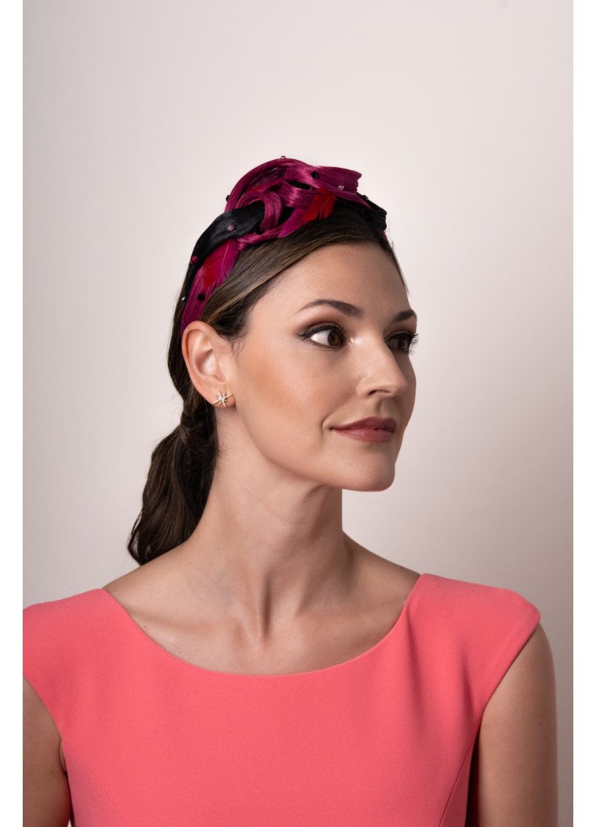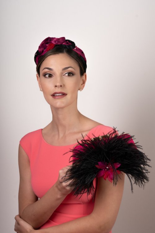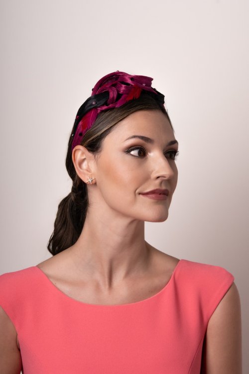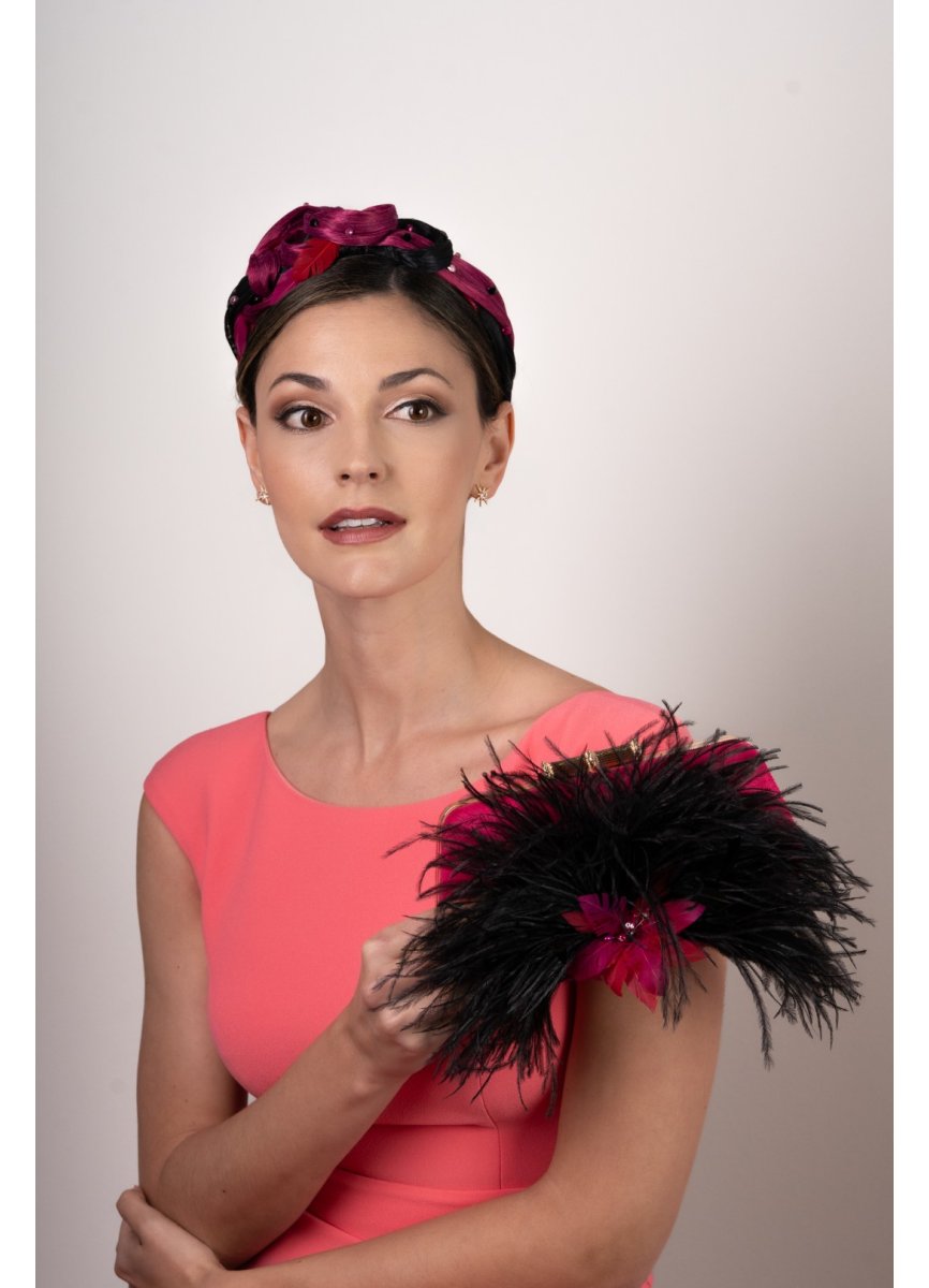 Diadema decorada en sinamay seda tonos buganvilla y negro que dan contraste a la pieza. Con un entrelazado delicado realzado por unas bolas y plumas forman un ponible tocado. Med. 44cm. 6cm. La parte más ancha. Aprox.