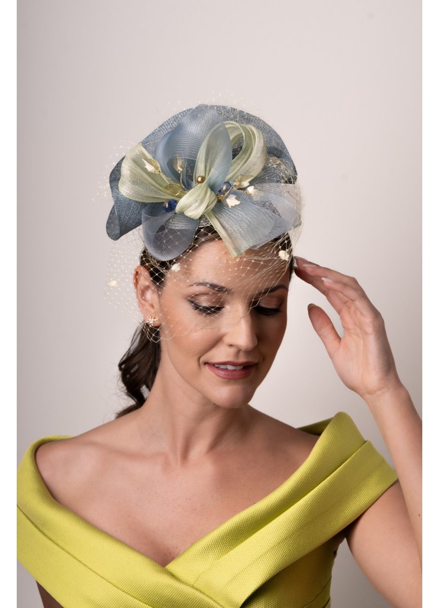 Ala con base en azul plomizo y red en verdecito con topos. Culminando el diseño lazadas de sinamay y crin con una ramita de hojitas y bolas translucidas. Med. 22cm. 21cm. Aprox.