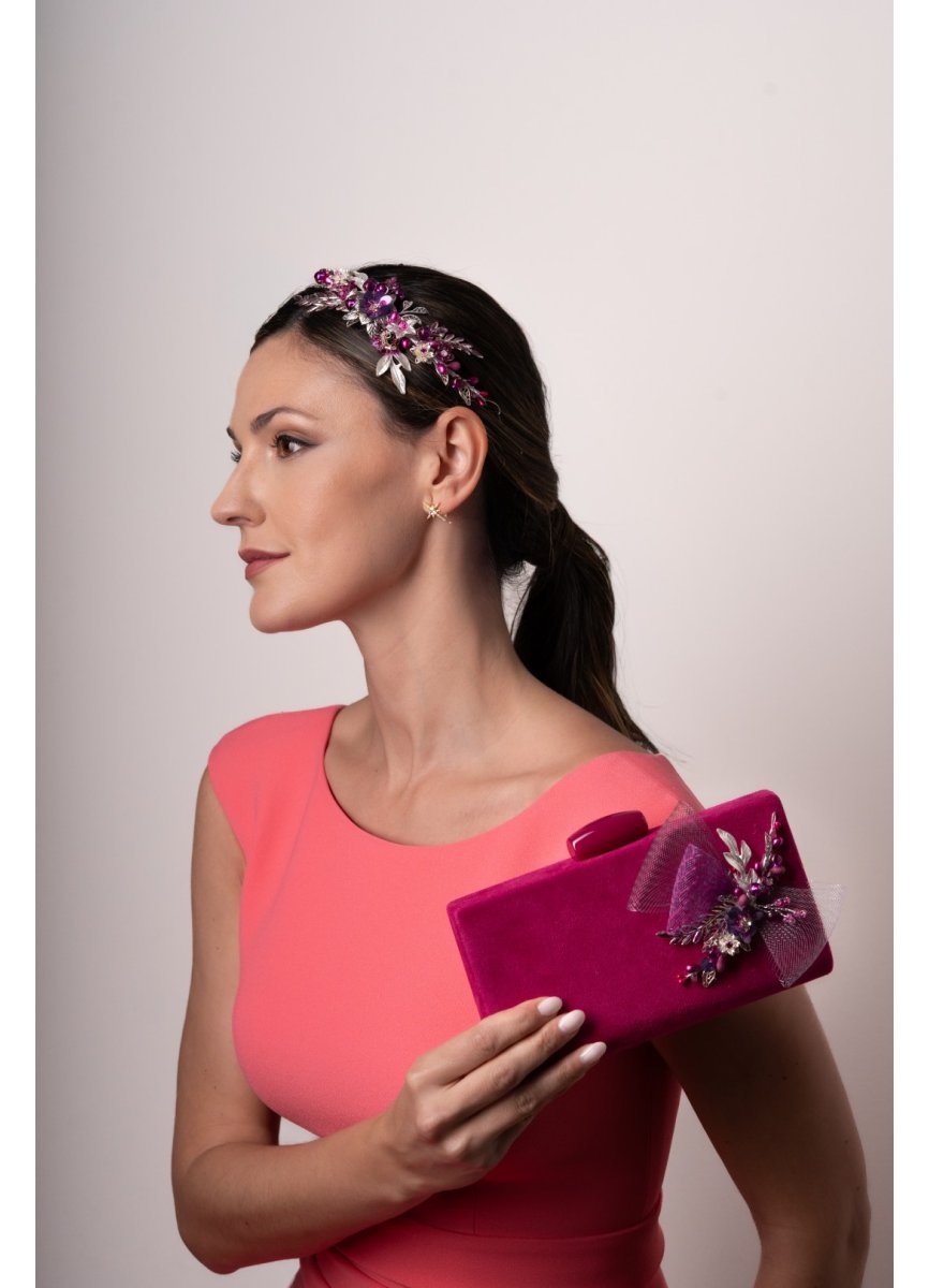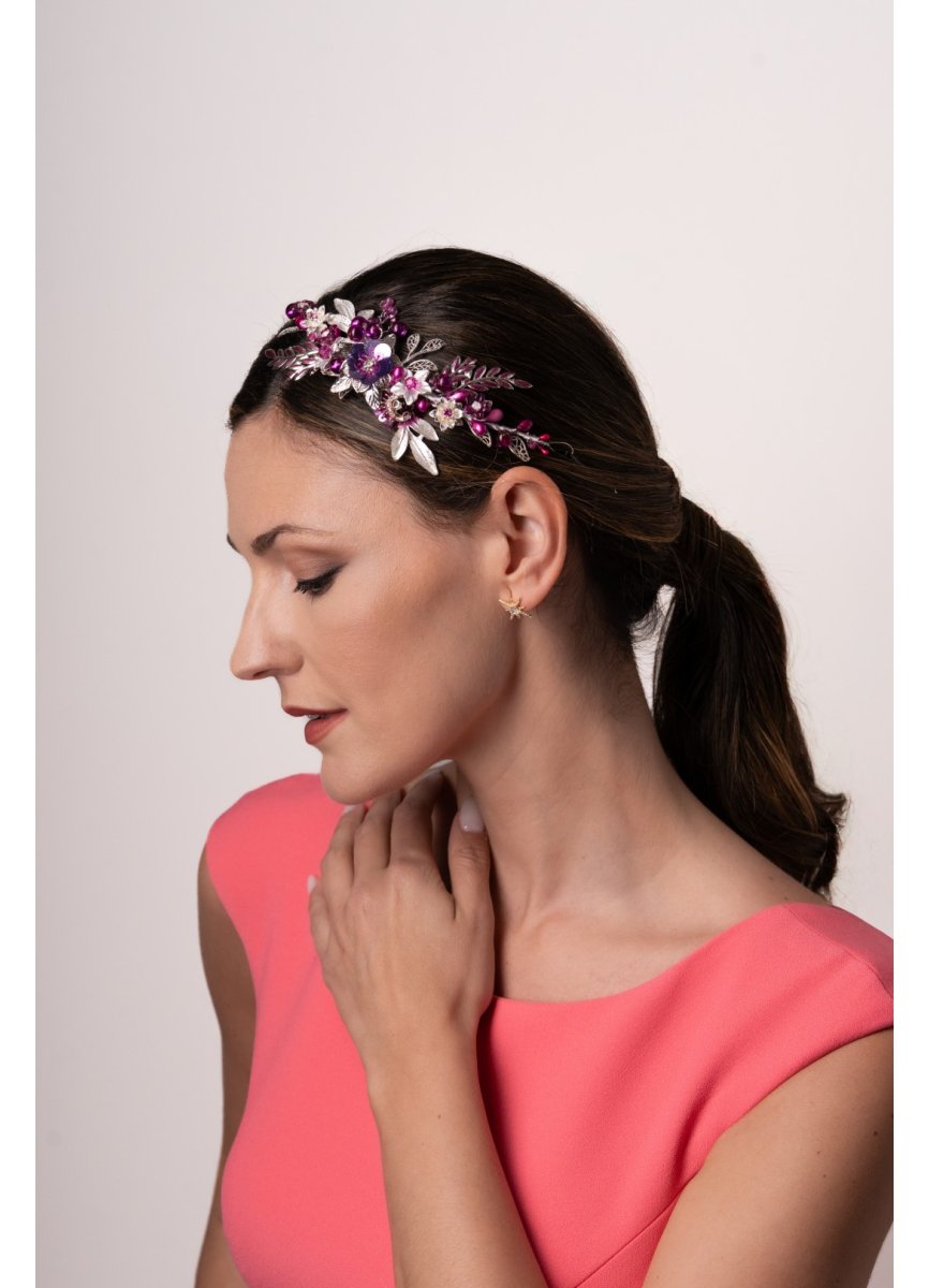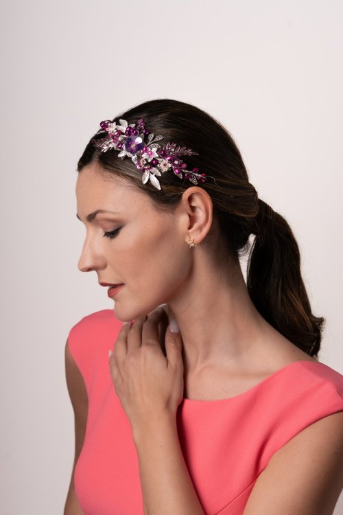 Tocado tipo joya joya en tono buganvilla y plata. En su mayoria realizado con piezas de metal, bolitas y pistilos crean un diseño armonioso. Algunas piezas tienen un nacarado que dan luz. Med. 18cm. Aprox.