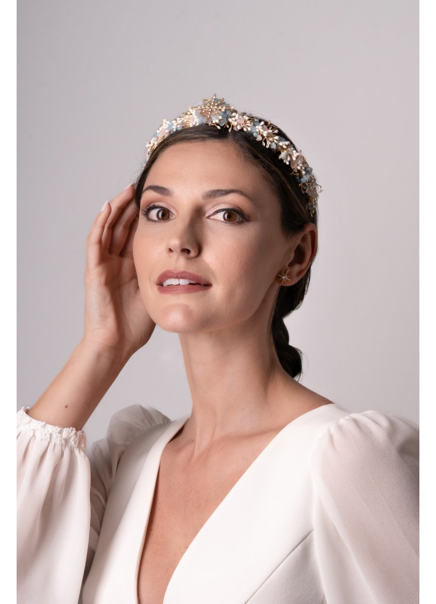 Tocado tipo joya en forma de tiara adaptable a diferentes colocaciones, en tonos blanco, oro y celeste. Este diseño esta formado de ramitas decoradas y hojas de metal. Med. 35cm. X 4, 5cm. Aprox.