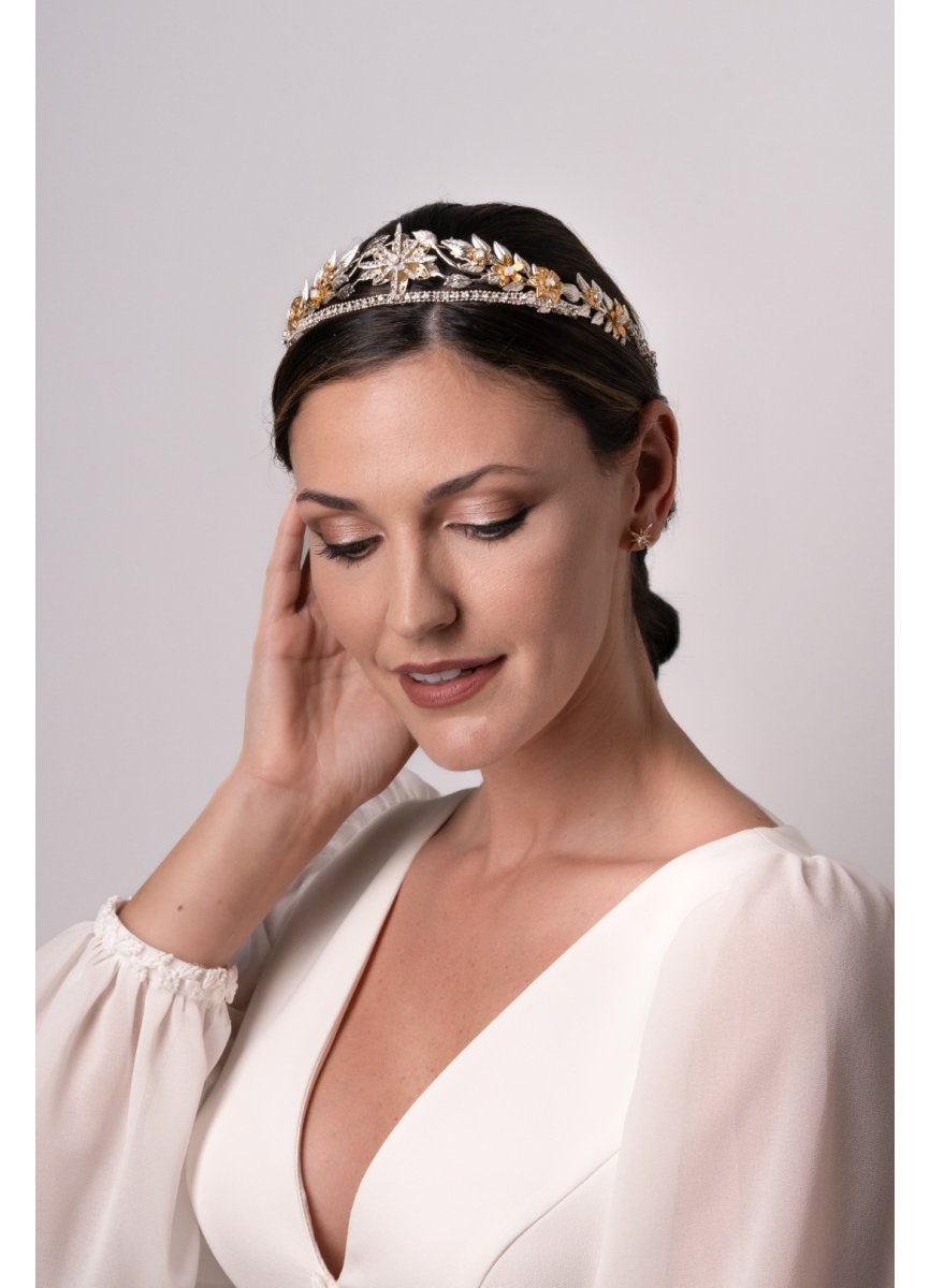 Tiara de metal plateado y dorado con estrella central, florecillas y ramas que dan forma al tocado. Es un diseño sencillo pero da luz al peinado. Med. 36cm. X 3, 5cm. Aprox.