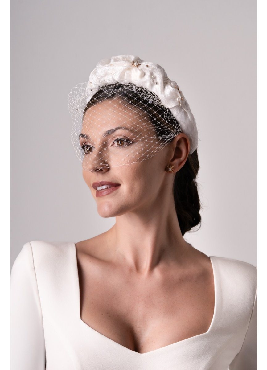 Diadema acolchada forrada en tela brocada y haciendo un fruncido muy sutil que da volumen a la pieza. Va adornada con flores de metal rosado, perlas, bolitas y brillos. Lleva una red con brillos como toque final. Med. 40cm. X5cm. Aprox.
