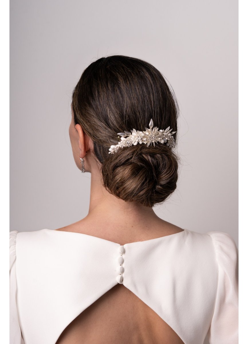 Tocadito de pistilitos pequeños nacarados y estrellas de metal plata. Lleva unas ramitas en metal plateado y una peina para acomodarlo tanto en un recogido, hacia un lado etc. Med. 16cm. X 3cm. Aprox.