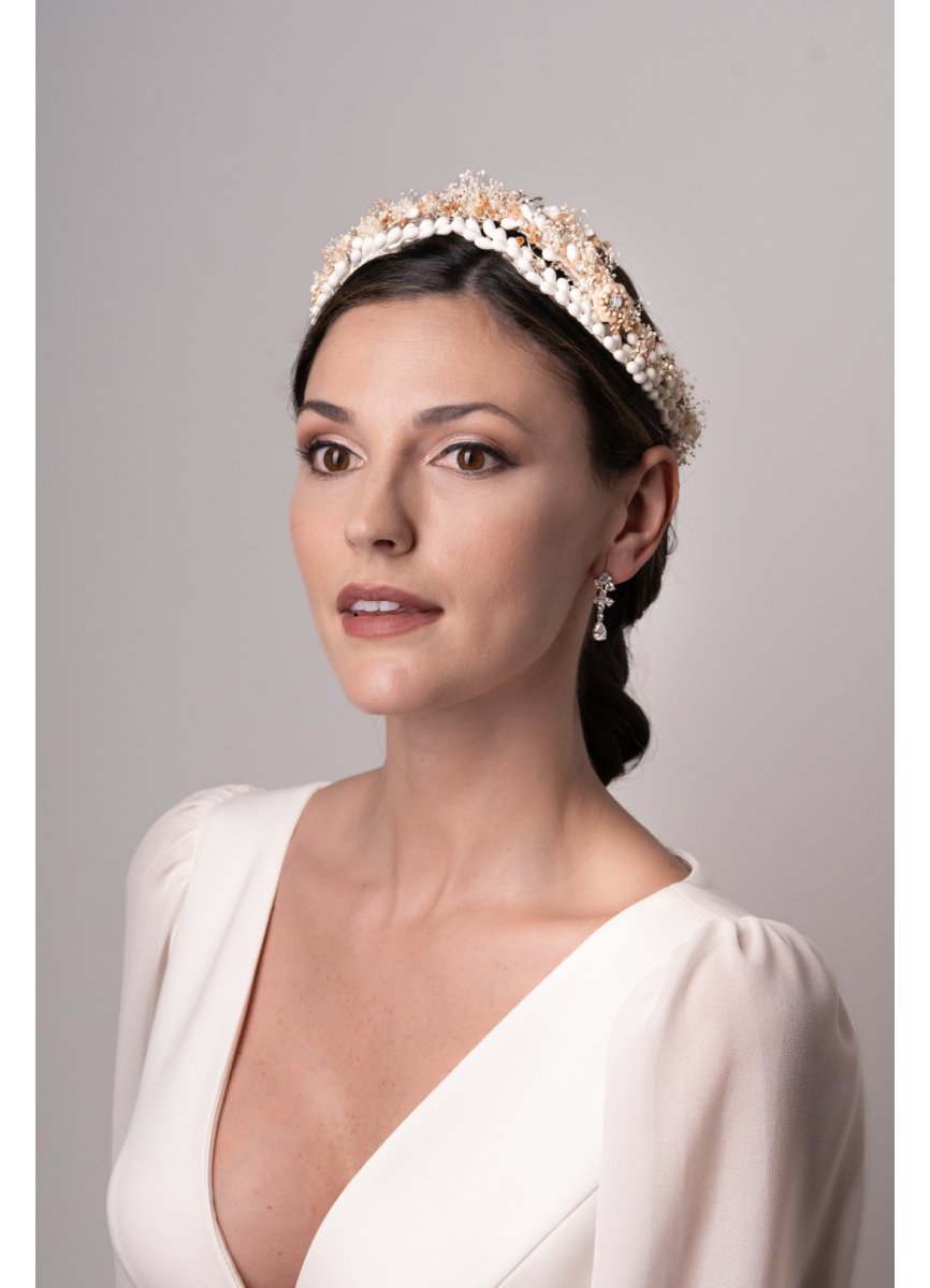 Tiara en paniculata natural y salmón con pistilos blancos y florecillas de metal. Es un tocado muy fresco y particular. Med. 45cm. X 3, 5cm. Aprox.