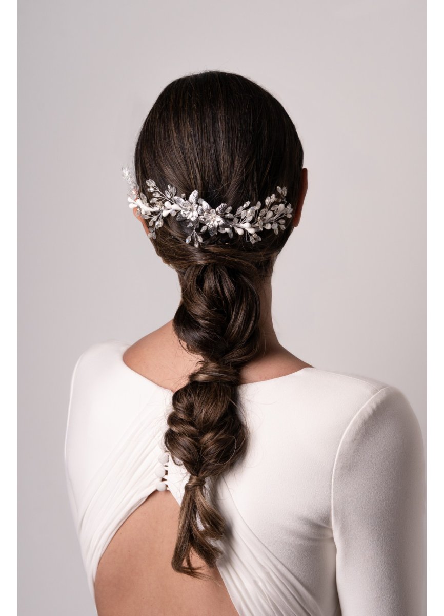 Tocado tipo joya flexible en cristal y metal plateado. Por su estructura se adapta a cualquier forma y con sus peinecillas facilitan la sujección. Lleva dos flores centrales. Med. 23cm. X 4, 5cm. Aprox.