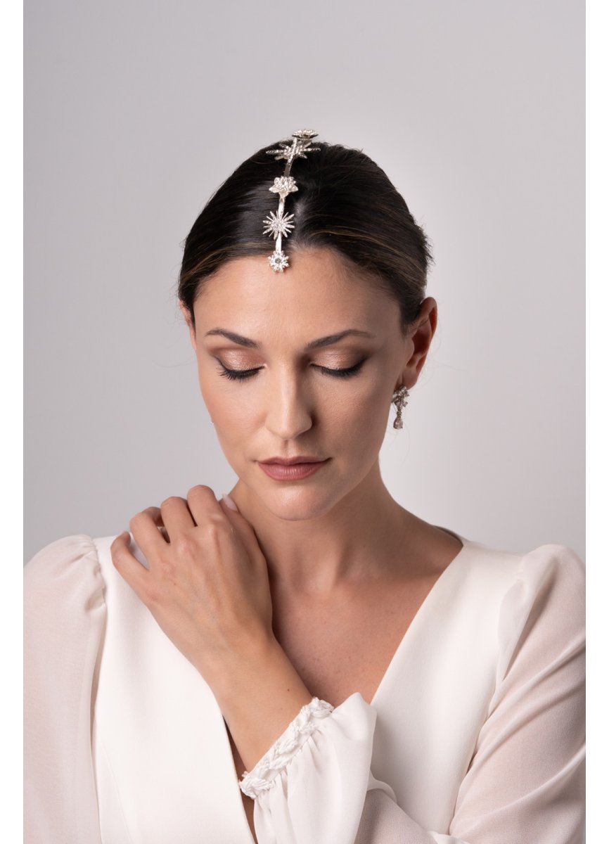 Tocado tipo joya raspa para colocar en la ralla del cabello. Con una base de metal rigida. Su diseño esta formado por estrellas de diferentes tamaños y diseños. Lleva unas peinas para la colocación. Med. 21cm. X 3, 5cm. Estrella mayor. Aprox.