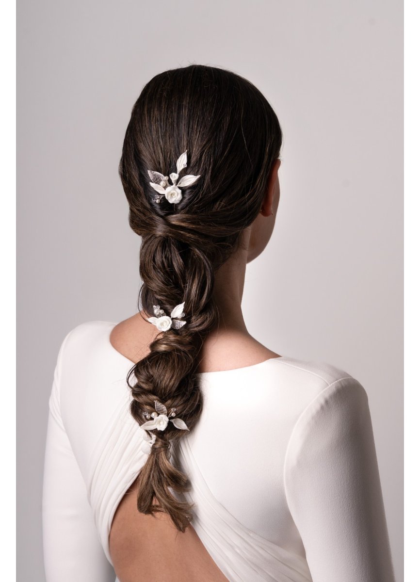 Juego de tres peinas con rosas de porcelana centrales en tono blanco natural. Tanto flores como hojitas de porcelana son hechas a mano. Lleva unas hojitas de maya y bolitas de cristal liadas en hilo de metal. Med. Entre 4 y 3cm. Aprox.