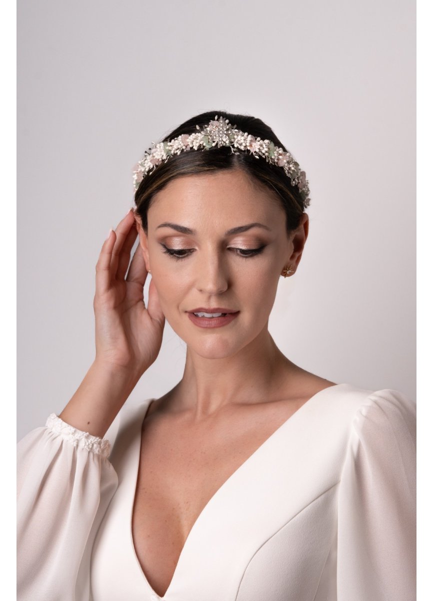 Tiara de pistitos nacarados, cristales en rosa y verde y ramitas de metal plateadas. En el centro una estrella de brillos en plateada marcan el centro. Lleva brillitos repartidos para dar luz. Med. 38cm. X 3, 5cm. Aprox.