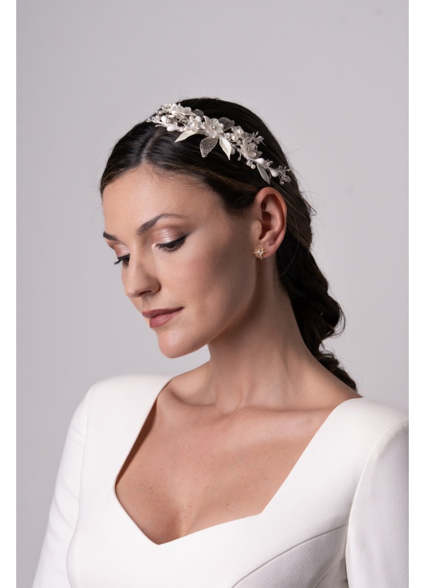 Tocado tipo joya joya en color natural y unas ramitas en plateado. Lleva tres flores hechas de porcelana y luego nacaradas con chatón central. Para dar volumen hojitas hechas de maya con bolas y perlitas acompañando. Med. 17cm. X 5cm. Aprox.