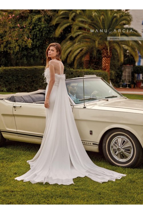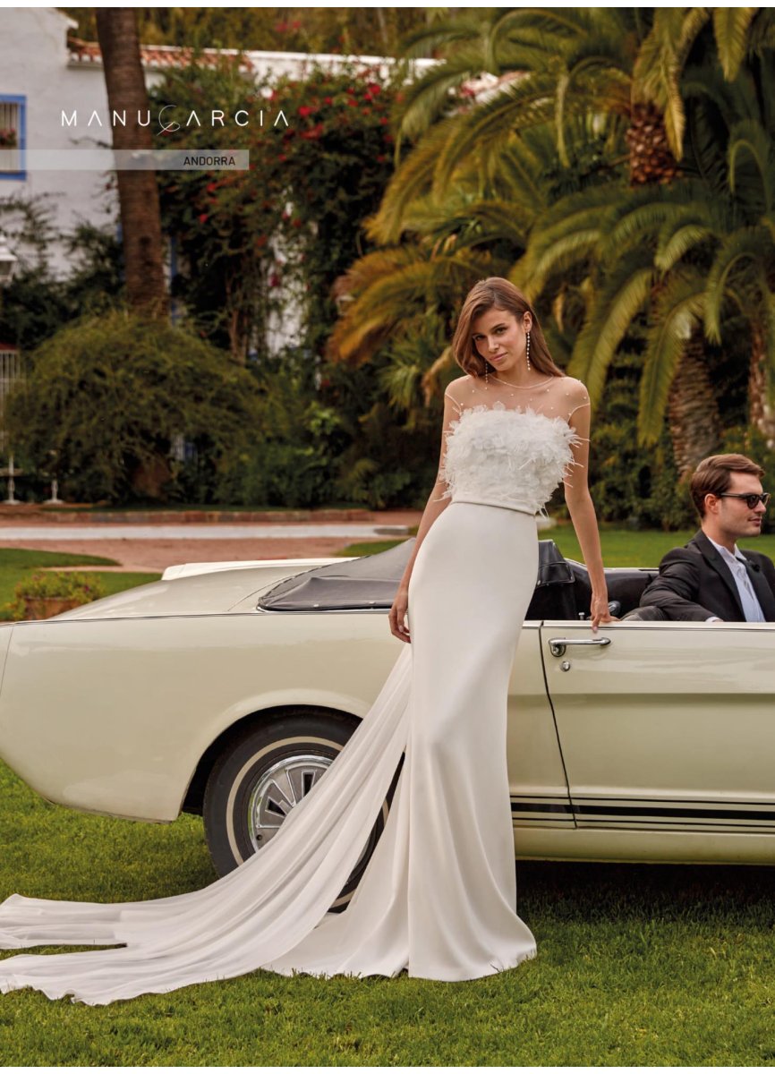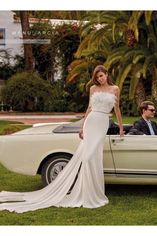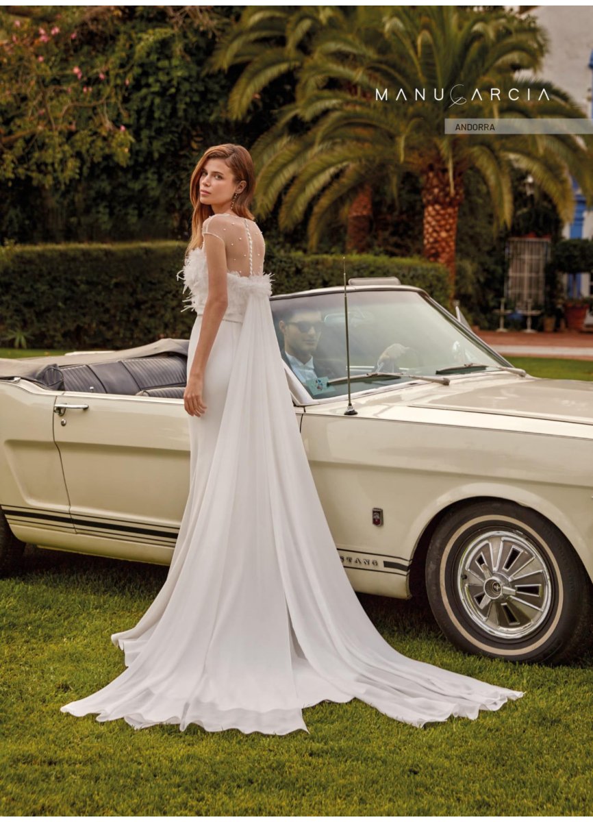 Vestido de novia de corte sirena y estilo romántico. está confeccionado en crepe combinado con un tul bordado con flores en 3D. Muestra un cuerpo con escote palabra de honor. con un sobre escote ilusión barco en tul con plumeti. Del medio de la espalda entre las flores del cuerpo salen dos caídas en georgette en forma de colas a lo largo del vestido.