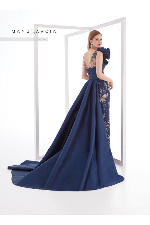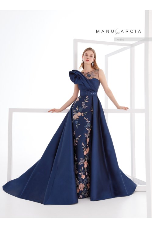 Espectacular vestido de fiesta compuesto de dos piezas. un vestido de pedrería con escote barco ilusión sin mangas. de línea entubada. cortado en cintura y con un espectacular adorno de volantes en un lateral del cuerpo. La cintura se ciñe gracias a un cinturón forrado. Este conjunto se complementa con una gran sobrefalda desmontable confeccionada en pique. un vestido de costura sin duda que será el centro de todas las miradas.