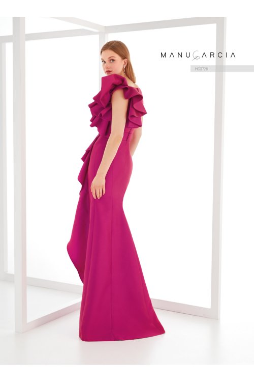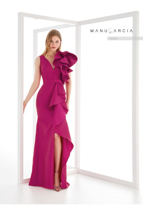 Vestido juvenil confeccionado en jacquard y de línea sirena. Presenta un cuerpo con escote en V y espalda cerrada. En el delantero luce una espectacular cascada de volantes que adorna un costado hacia el hombro. la cintura se adorna con fajín de lorzas asimétrico. dejando paso a una falda con una amplia abertura adornada también con una cascada de volantes.