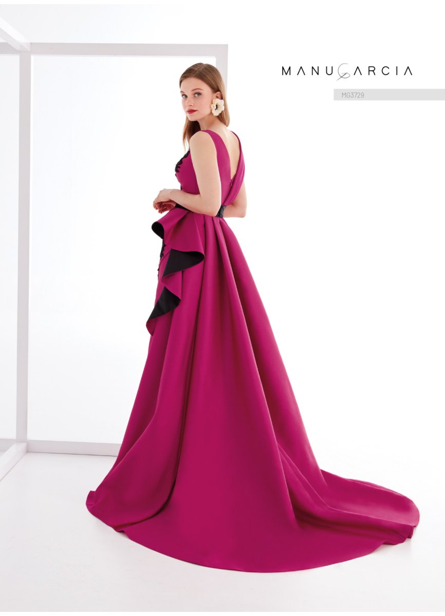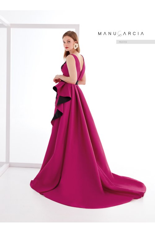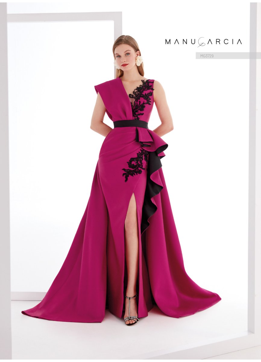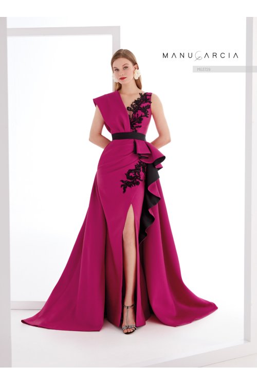 Espectacular. así es cómo podemos definir este vestido de fiesta de la línea de costura. Está confeccionado en jacquard y presenta un cuerpo de escote en V y espalda abierta. con un cuello solo en un lado del cuerpo que se prolonga hacia la espalda. adornado en el delantero con aplicaciones bordadas. La falda es de línea entubada abierta en el delantero. con un original diseño fruncido hacia un costado. adornada con una cascada de volantes. este look se completa con una cola extraíble del mismo tejido.