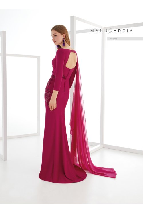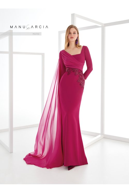 Vestido de fiesta. ideal para cualquier evento. de línea sirena confeccionado en crepe y gasa. Presenta una manga pegada semi. un cuerpo de escote cuadrado y una espalda abierta también con escote cuadrado. El cuerpo destaca por el drapeado de gasa asimétrico que lo adorna saliendo del hombro a la cintura. dejando paso a un falda larga con una espectacular caída adornada con aplicaciones bordadas del mismo tono que el vestido. El drapeado se prolonga a lo largo de la espala con una caída en forma de capa.