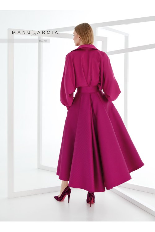 Conjunto de dos piezas de fiesta. se compone de una blusa de crepe satén amplia con cuello camisero y mangas murciélago. Este look se completa con una falda confeccionada en pique de largo midi tableada y su cintura se ciñe con un cinto forrado en pique que aportando a este look un estilo más moderno.