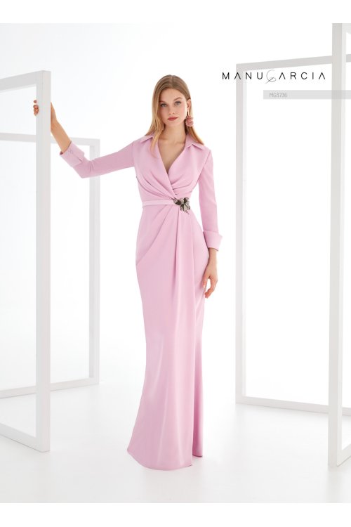 Elegante vestido largo de fiesta confeccionado en crepe. Presenta un cuerpo de cuello camisero drapeado con escote en V. con la espalda cerrada y mangas semi con puño vuelto. La cintura se adorna con broche de cristal. dejando paso a una falda femenina que se pega al cuerpo de línea sirena y drapeada en un costado del delantero.