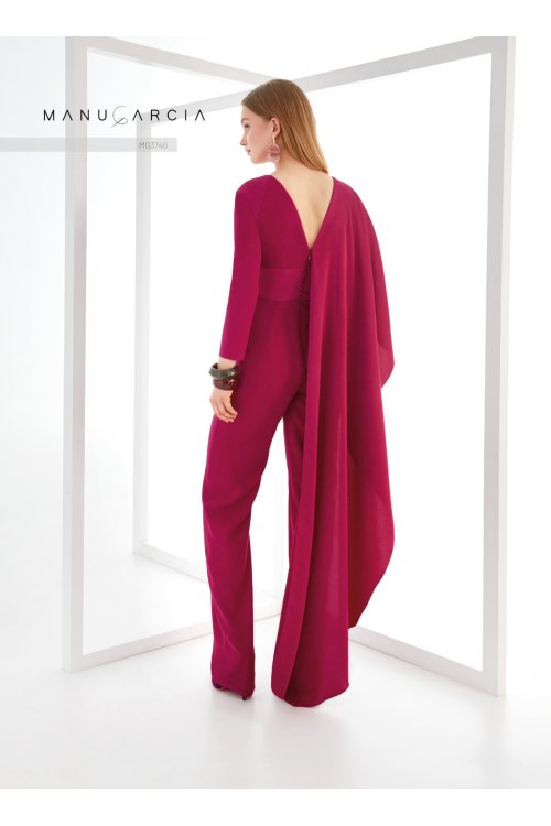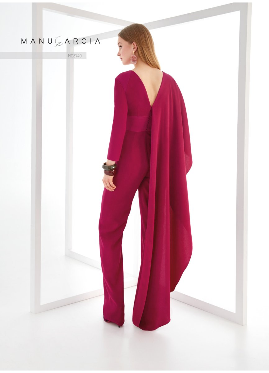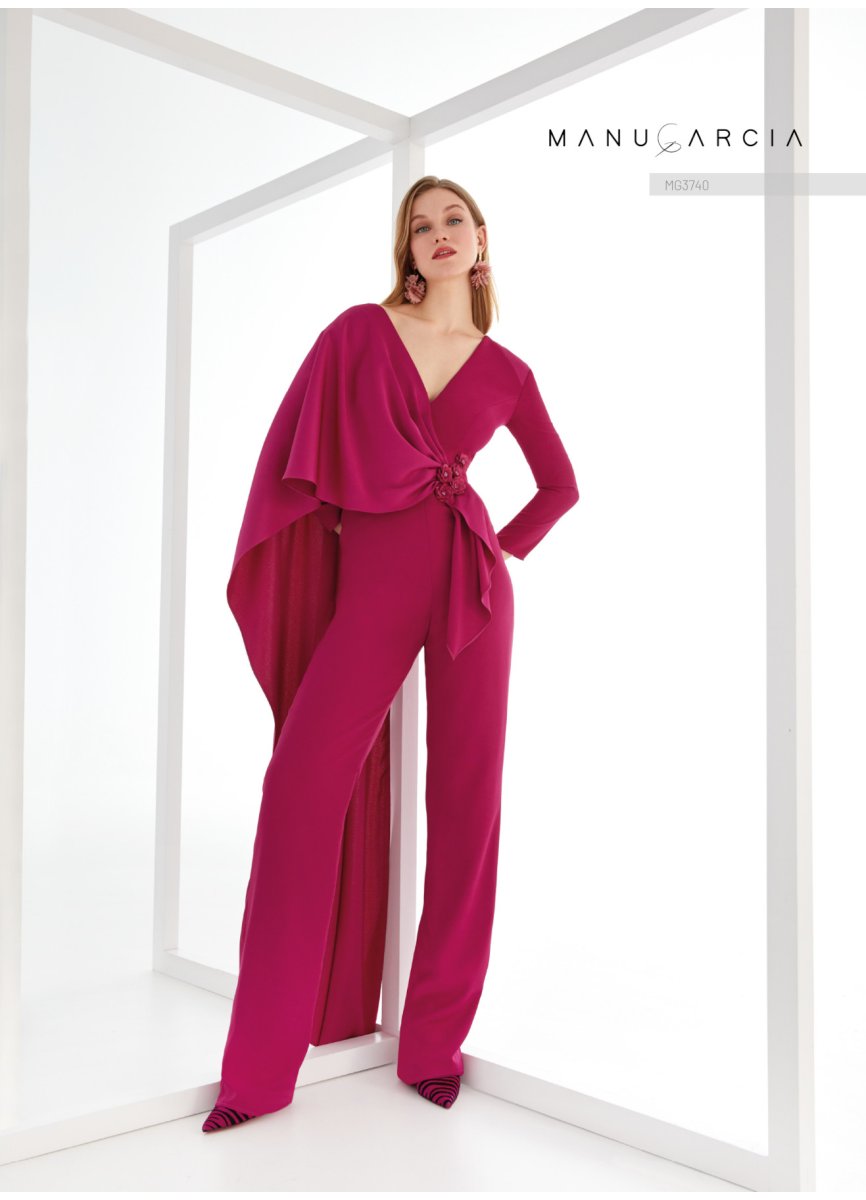 Déjate seducir por este mono de fiesta confeccionado en crepe. con un cuerpo de escote en V en el delantero y la espalda. y con manga pegada. Luce un hombro adornado con una capa que se recoge en el centro delantero con un broche de flores en 3D. la capa cae hacia la espalda a lo largo de la prenda.