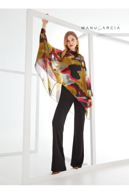 Juvenil conjuntos de dos piezas que presenta un mono elegante cortado en cintura con un cuerpo de escote en V y la espalda abierta. Se completa este look con una sobre capa de georgette estampado de escote a la caja chimenea y con una lazada ladeada que aporta glamour a este diseño diferente.