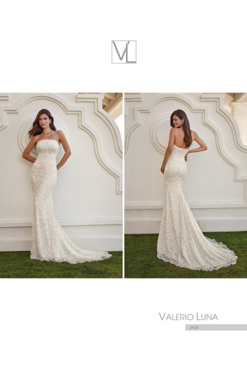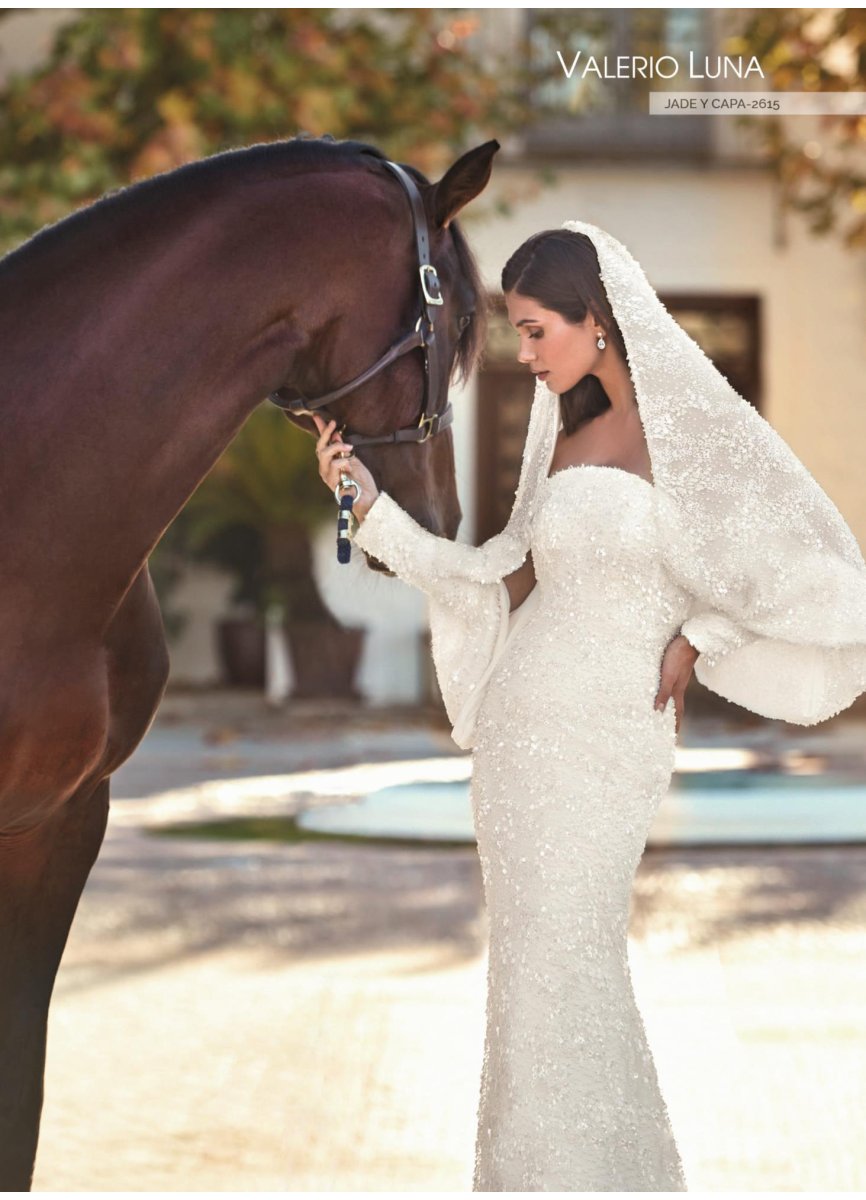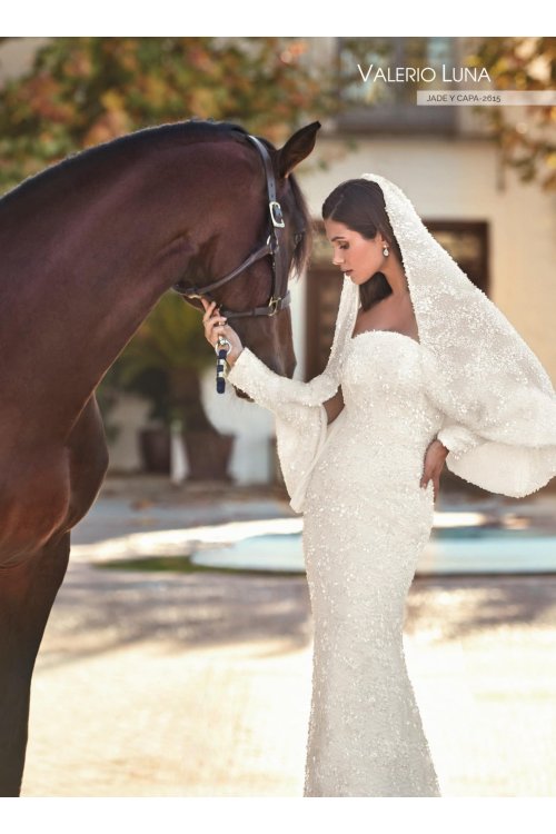 Vestido de novia de corte sirena. confeccionado en un espectacular tejido de fantasía y pedrería. Muestra un escote palabra de honor encorsetado y una falda que se desliza por el cuerpo con suavidad terminando en una bonita cola. Un diseño diferente y muy femenino que será el centro de todas las miradas. Puedes combinarlo con una preciosa capa a juego en el mismo tejido.