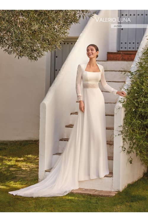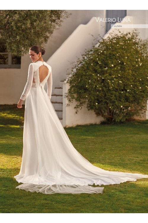 Vestido sofisticado de línea en A. confeccionado en georgette con acabados de encaje. Presenta un cuerpo de escote cuadrado. una espalda abierta de fantasía con tul adornada con tiras de encaje y manga larga adornada también con encaje. al igual que la cintura semitransparente. dejando pasa a la falda fluida y ligera. Un modelo elegante y muy en tendencia.