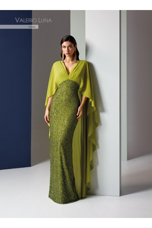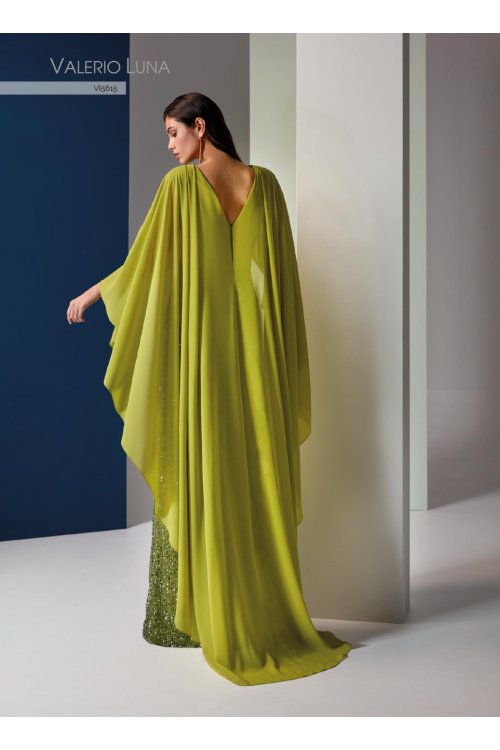 Vestido de fiesta largo muy favorecedor donde la falda es el centro de atención en este look. de cote sirena. está confeccionada en tul bordado en cristal. de talle alto con terminación en forma de pico. El cuerpo confeccionado en gasa. presenta un escote en forma de V drapeado. la espalda es subida en forma de capa como las mangas.