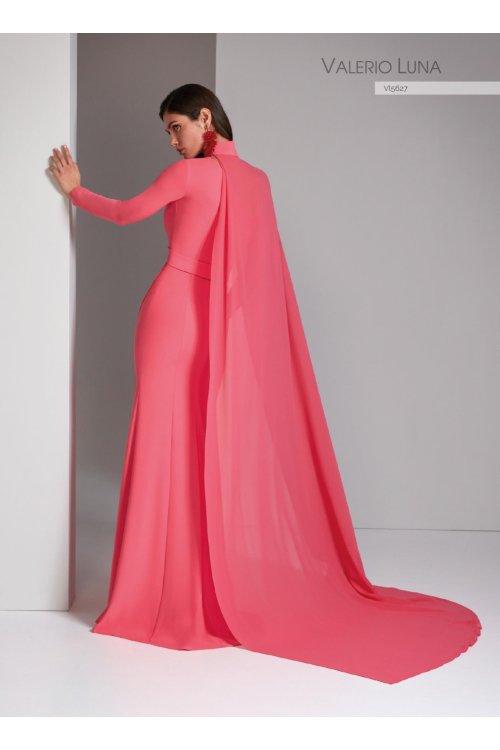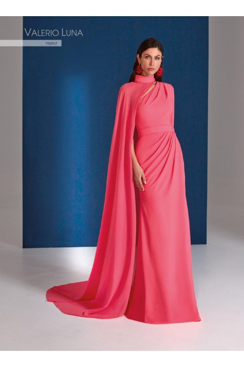 Vestido de fiesta de dos piezas confeccionado en crepe. El traje presenta un escote asimétrico drapeado con una manga larga pegada y su falda es sirena recogida en la cintura con unas tablas. Este conjunto se completa con una capa asimétrica confeccionada en georgette sujeta en el cuello.