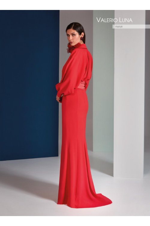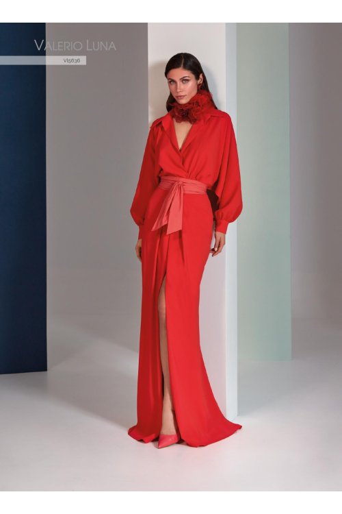 Parece un vestido pero en realidad es un conjunto de dos piezas confeccionado en crepe satén. La falda de línea sirena. con una amplia abertura en el delantero. tiene dos pliegues centrales. es de talle alto y termina con un fajín drapeado con una lazada. El look lo completamos con una camisa de mangas murciélago de cuello camisero.