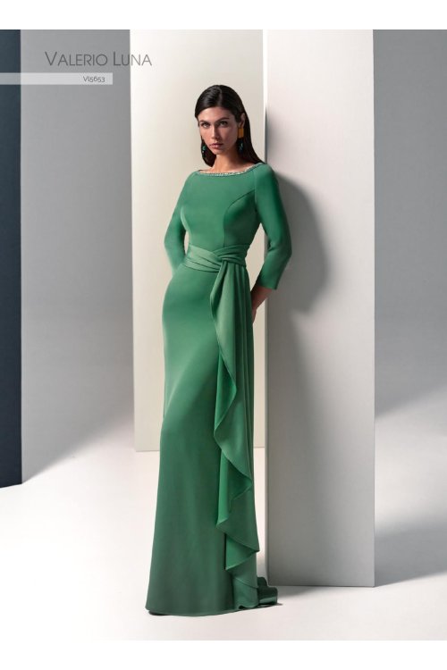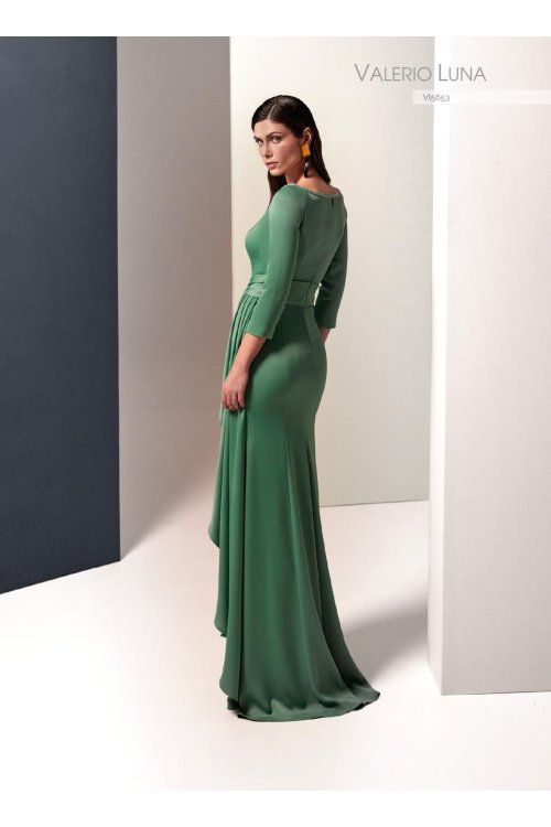 Vestido de fiesta confeccionado en crepe satén. Presenta un cuerpo de escote barco. espalda subida y manga semi pegada. La cintura se ciñe con un fajín de tablas. dejando paso a una falda larga de estilo sirena con una caída a lo largo del vestido por el costado de la falda. un look elegante ideal para ese evento tan especial.