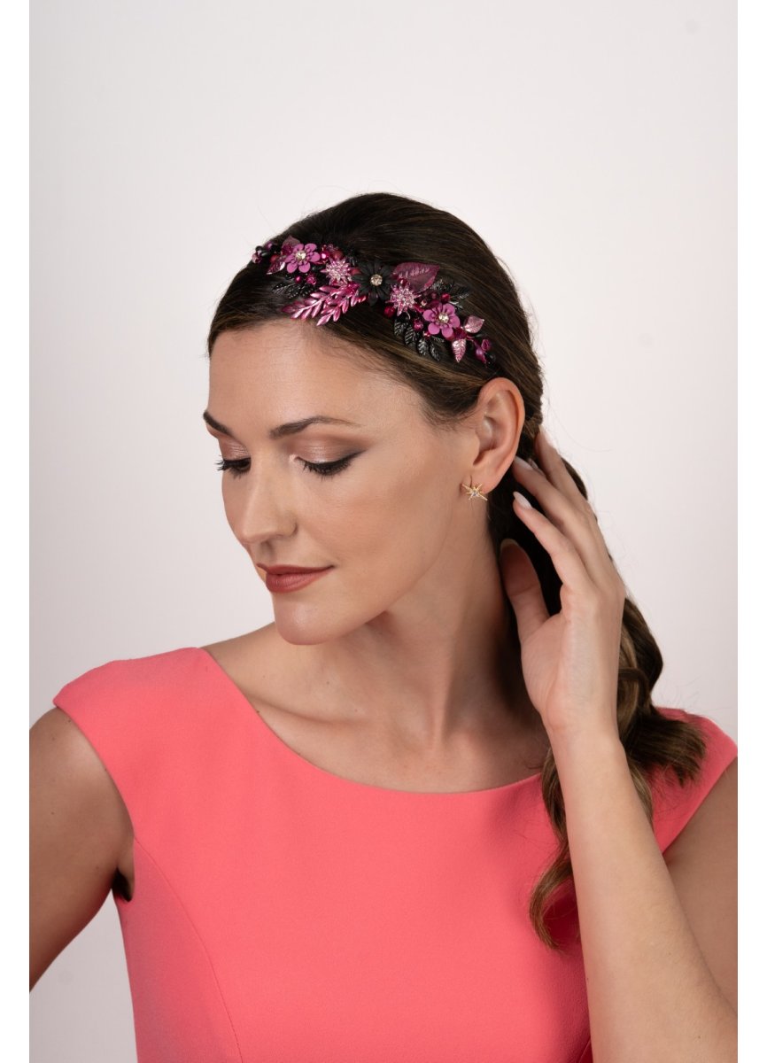 Diadema/alamar joya en metal buganvilla y negro. Compuesto de diferntes hojas, flores y estrellas de metal pintadas a mano, con un toque de brillos y lentejuelas. Med. 21cm. Aprox. Headband/alamar jewel in bougainvillea and black metal. Composed of different leaves, flowers and hand-painted metal stars, with a touch of glitter and sequins. Measurement 21cm. Approx.