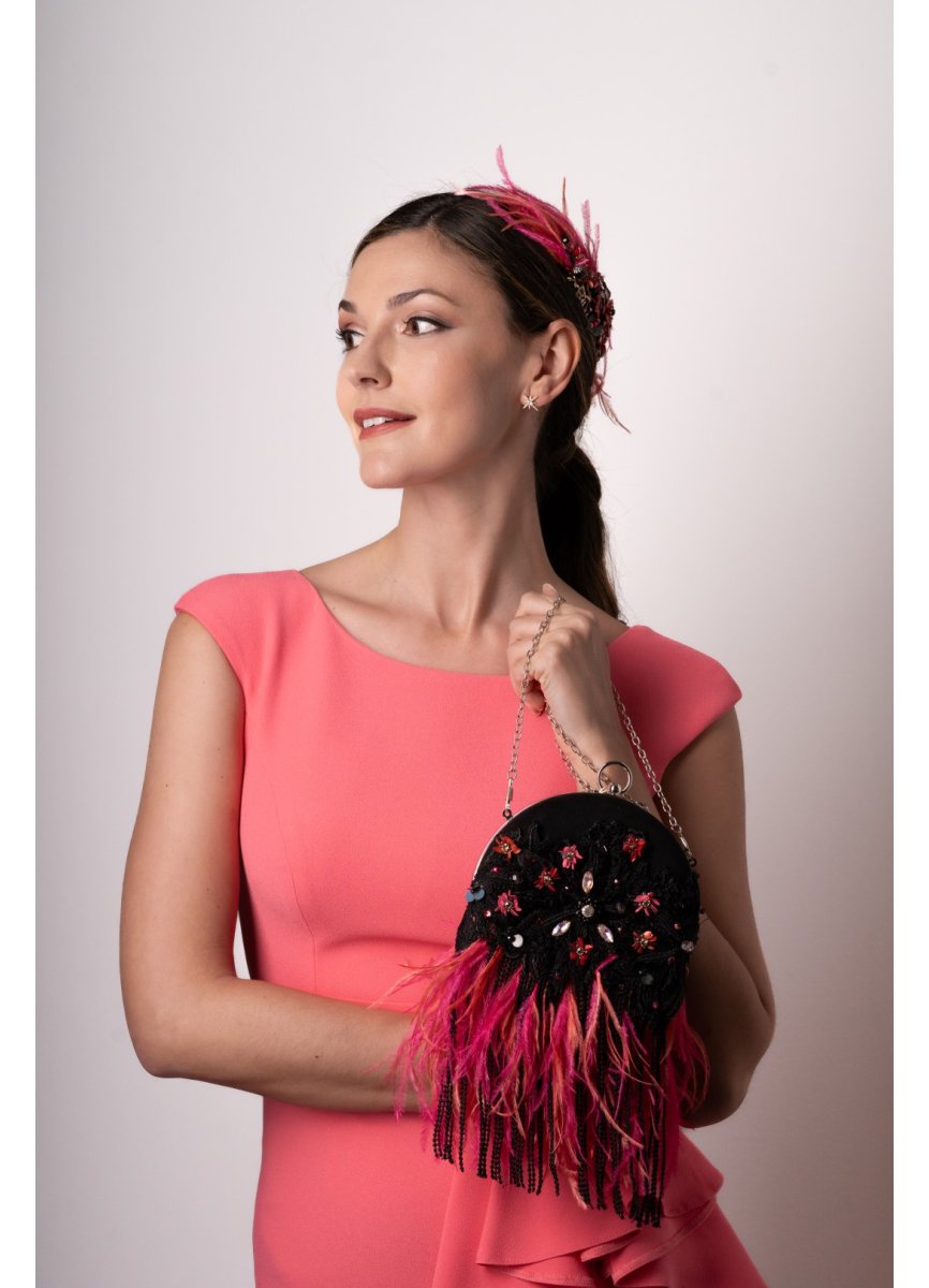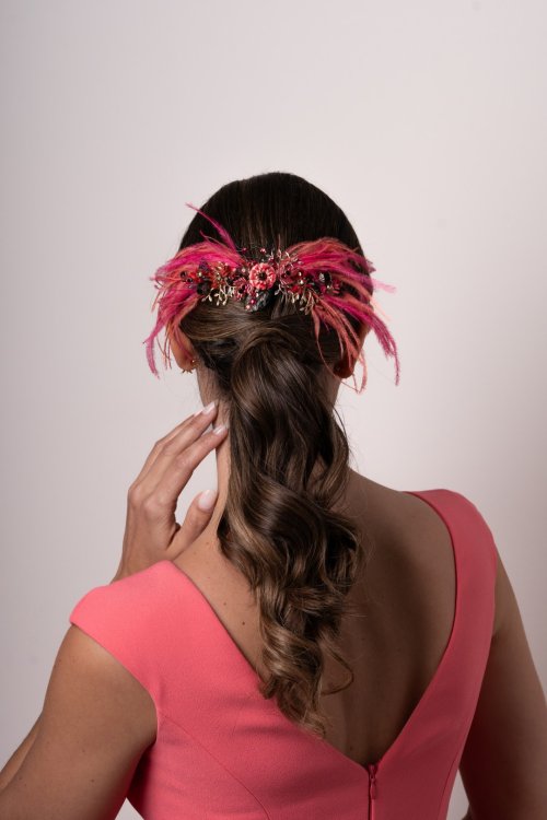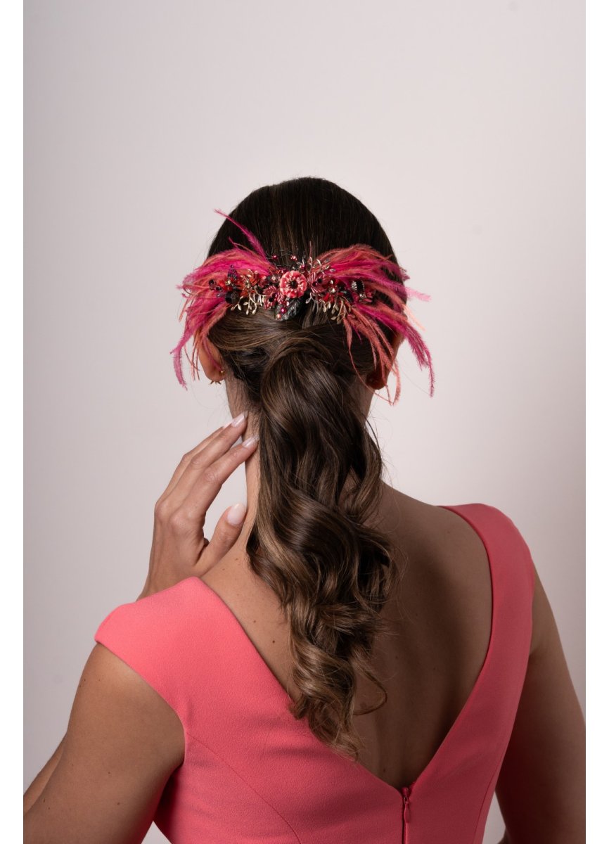 Jewel-like headdress in metal with gold and black tones, with feathers on its strawberry and coral sides, with a touch of glitter that enhances its colors. Measurement 17cm. Approx. + feathers.