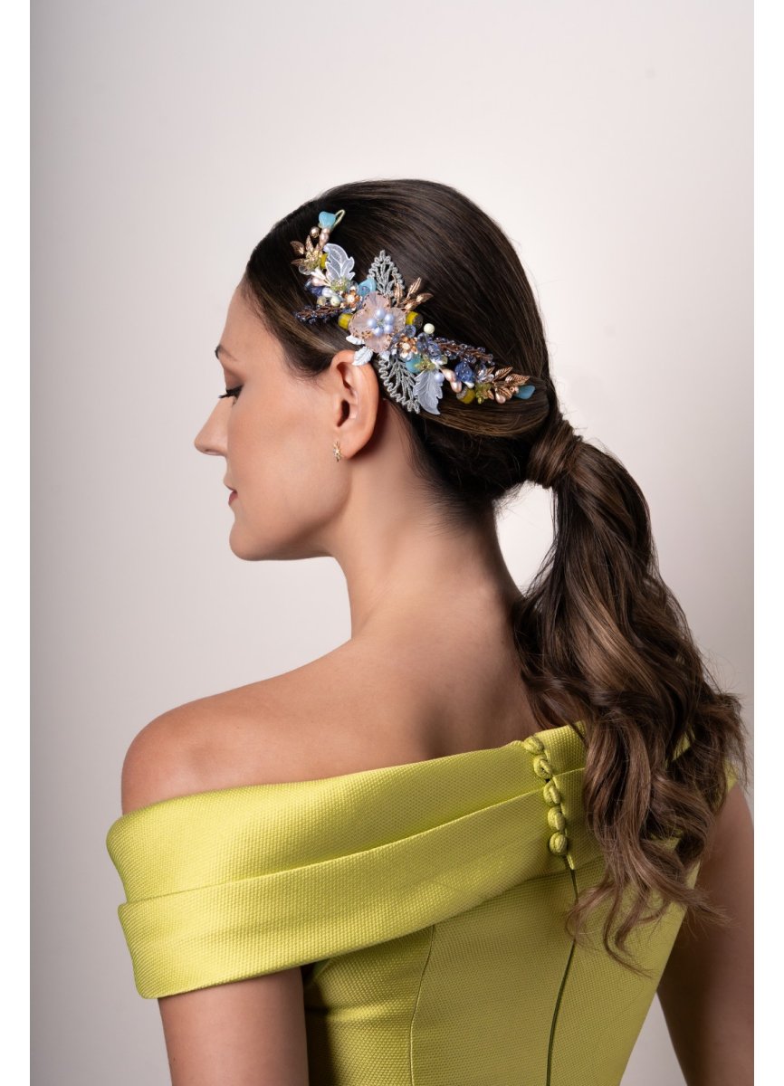 Tocado tipo joya joya celeste con toques en verde lima y rosa nude. Realizado con piezas de metal rosado, un par de hojas de tela, y variedad de pistilos y brillos. Med. 21cm. Aprox. Light blue jewel headdress with touches of lime green and nude pink. Made with pieces of pink metal, a couple of sheets of fabric, and a variety of pistils and glitter. Measurement 21cm. Approx.
