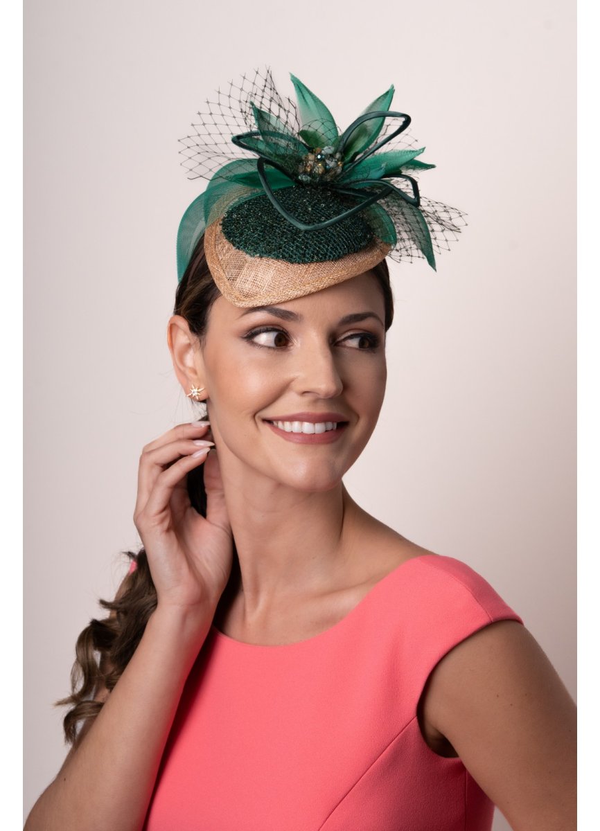 Teardrop jewel-type headdress with double base in green and beige tones. Small base lined with lace. The volume in this piece is given by some green horsehair petals and some satin strips. Stone brooch as a centerpiece. For placement, a lined headband.