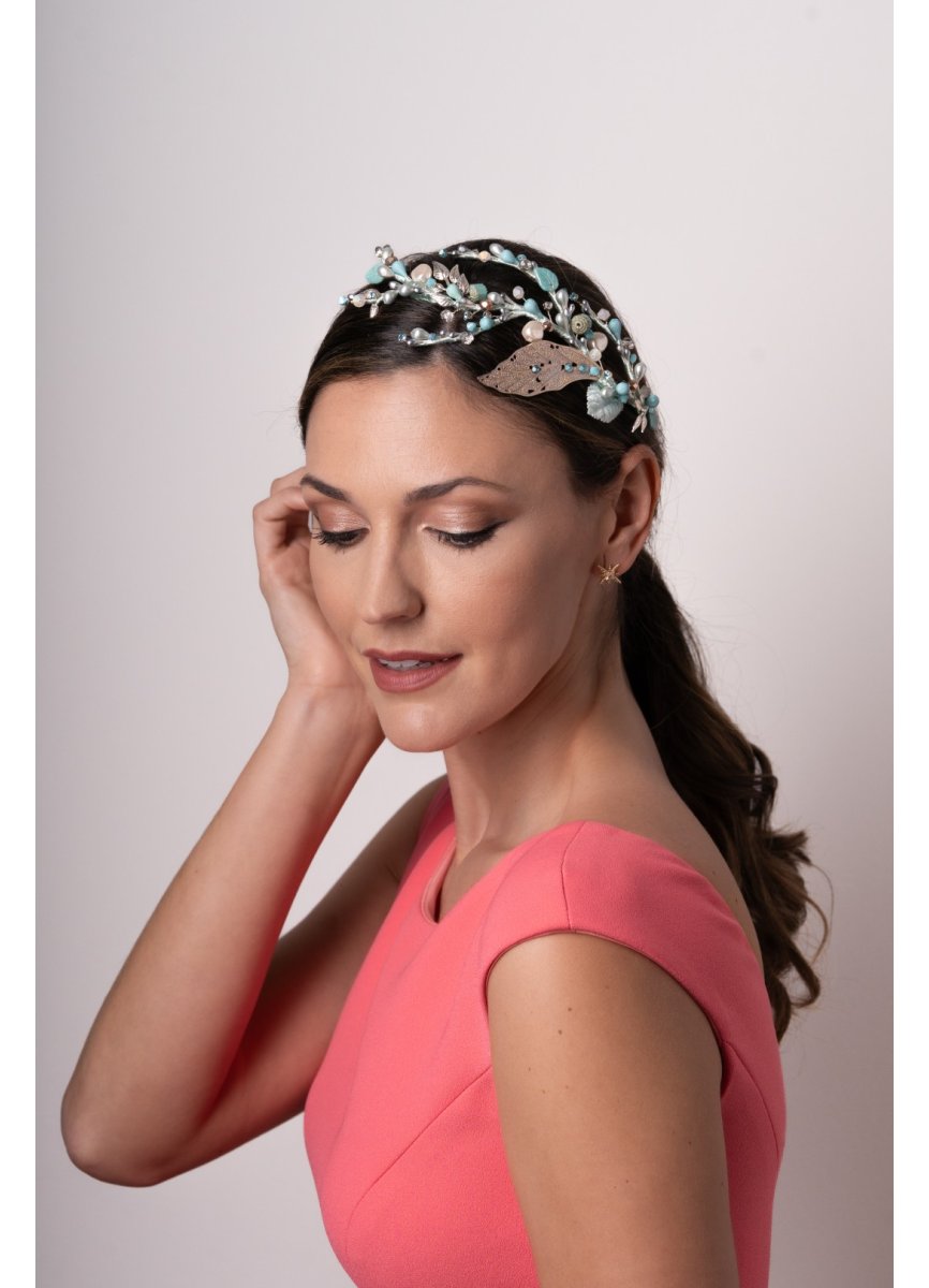Jewel headdress with twig design to one side in turquoise and silver tones. Made with pistils, a variety of balls and glitter. Metal and velvet leaves give shape to the headdress. Measurement 22cm. Approx.