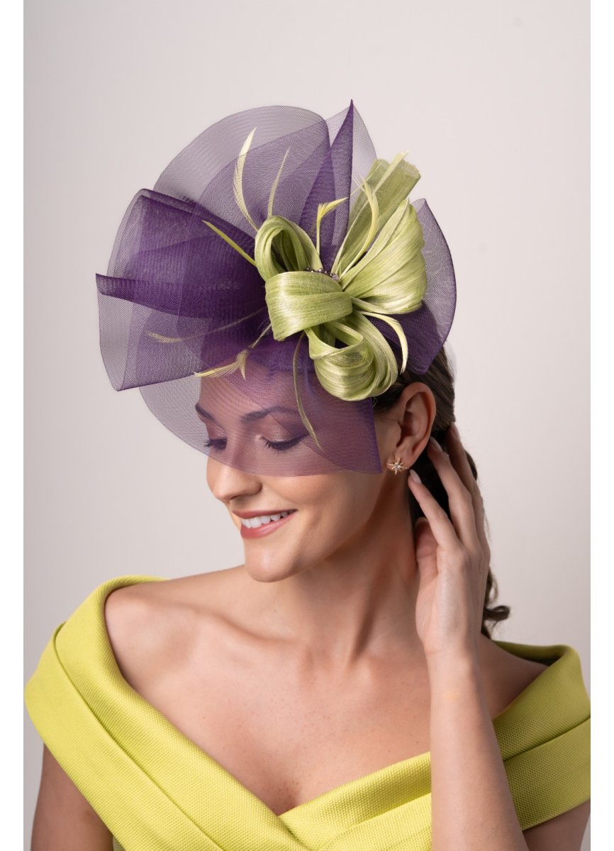 Jewel-like headdress with base and purple mane with voluminous shapes, which combine perfectly with a lime green sinamay bow and biot feathers. As the centerpiece, a brooch with matching stones. Measurement 25cm. X29cm. Approx.