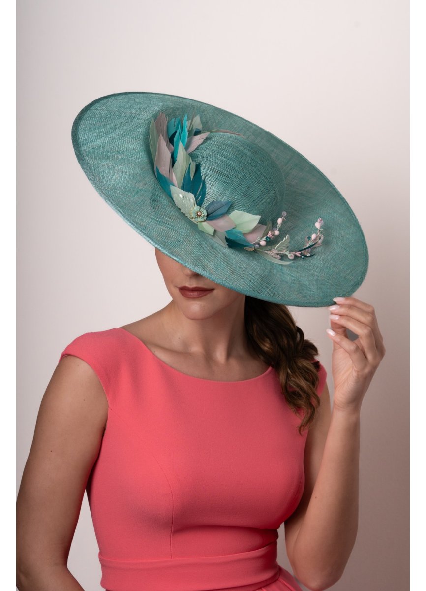 Sinamay pamela with decoration of duck feathers and strips of pistils, stones, balls and glitter all in two different shades of turquoise, green and dusty pink. Central enameled flower. For placement lined headband. Measurement 45cm. Approx.