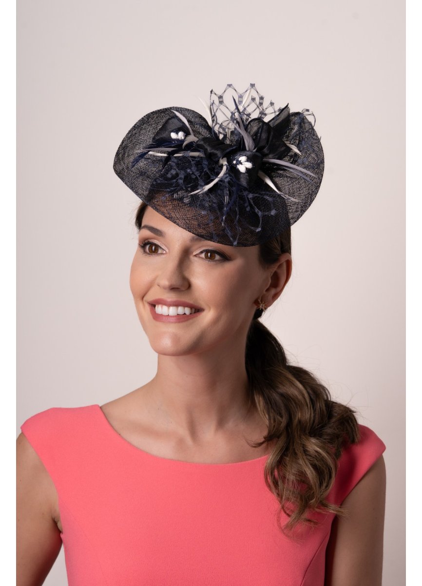 Blue hexagonal horsehair base. It is made up of horsehair and hexagonal horsehair creating different shapes. For the center, a set of feathers and matching lace. Comb to place it. Measurement 27cm. Approx.