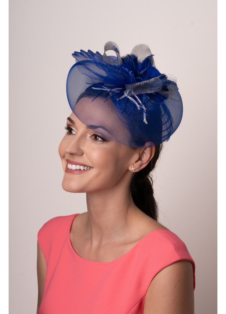 Wing based on night blue and with a touch of white. Decorated with silk sinamay, biot feathers and veil they form a very versatile headdress. For placement lined headband. Measurement 23cm. x 18cm. Approx.