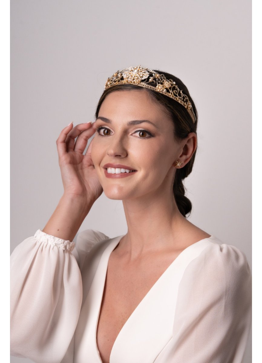 All metal tiara with circular shapes. A combination of gold, white and silver. Central glitter star decorated with flowers, stars and pearls. Measurement 33.5cm. Height 4.5cm. Approx.