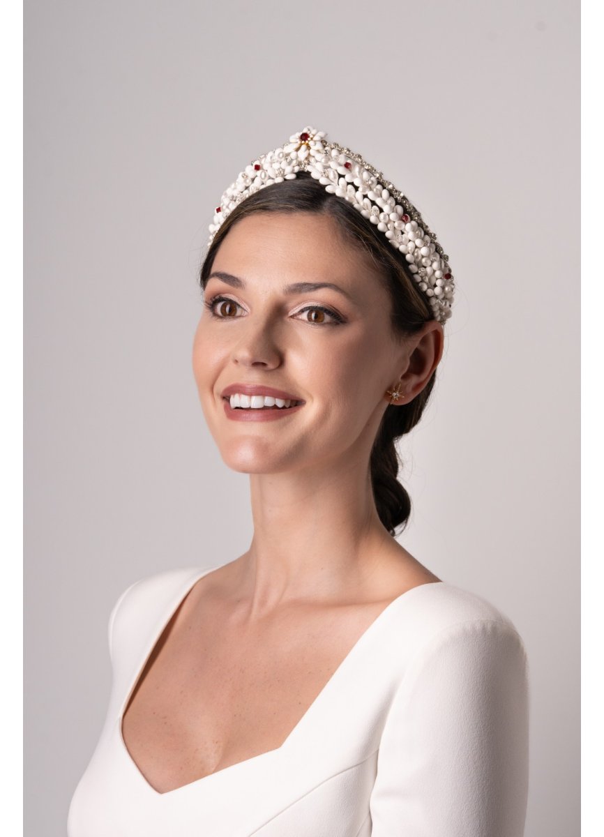 Tiara of natural white and pearly pistils with a glitter strip at the top. As a center, an enamelled flower with a garnet ball. For a touch of shine, some silver metal balls. Measurement 38cm. x 3.5cm. Approx.