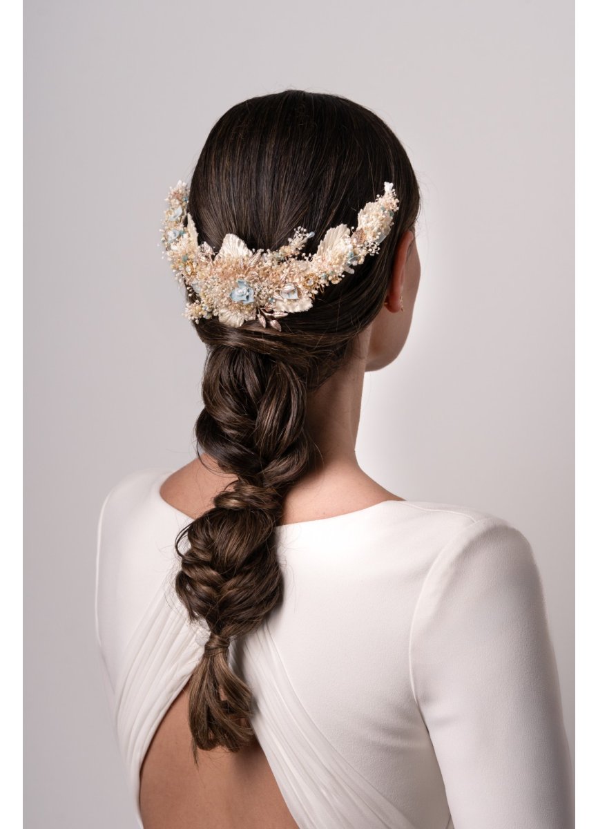 Semicircular jewel-type headdress in natural and pink preserved migi, with hand-made light blue porcelain flowers. It has some touches of gold and pink metal on twigs and flowers. On the back, some cream-colored imitation leather sheets. Measurement 26cm. x 6cm. Approx.