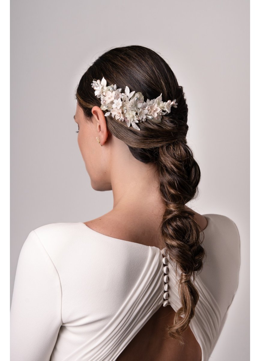 Porcelain flower headdress in pastel, pink and green tones. It is composed of a variety of porcelain flowers and leaves all handmade. As a complement, silver metal twigs, applications of beads and pistils. It has a silver metal butterfly fused between the flowers. Measurement 19cm. x 5.5cm. In the center. Approx.