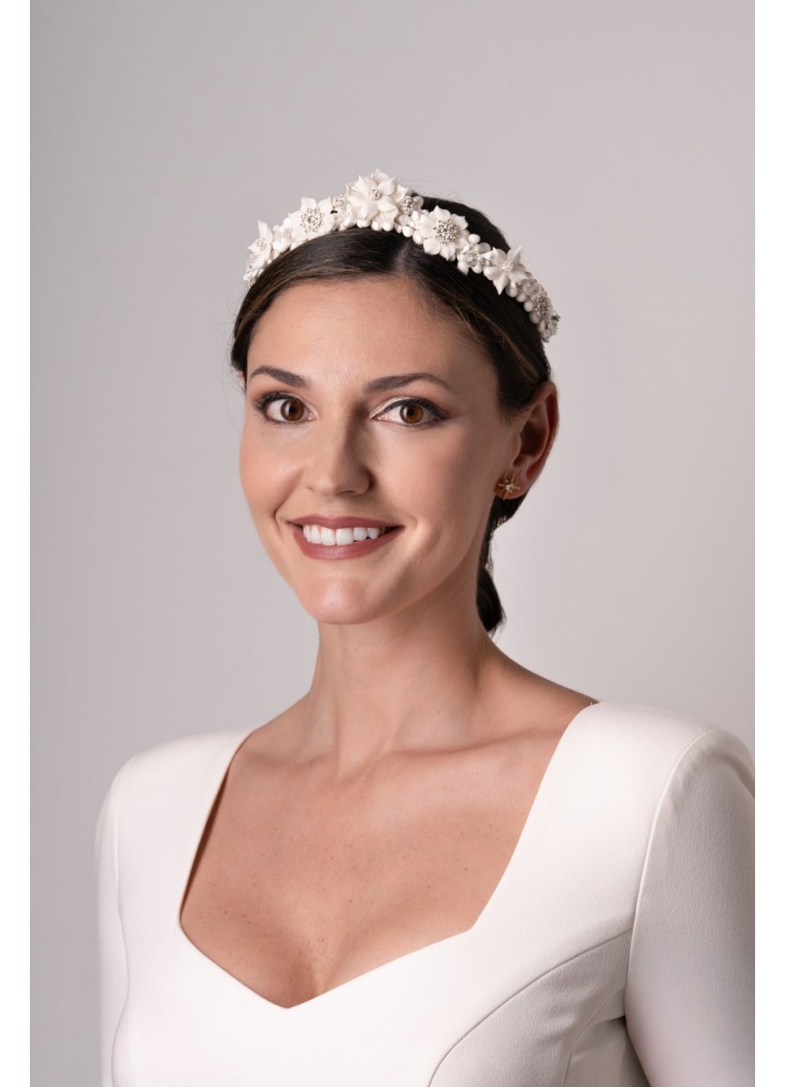 Tiara in natural color with shiny and pearly pistils. It has several handmade porcelain flowers with metal balls and glitter in the center. Due to its shape and structure, it adapts perfectly to the hairstyle. Measurement 30cm. X 3cm. Approx.
