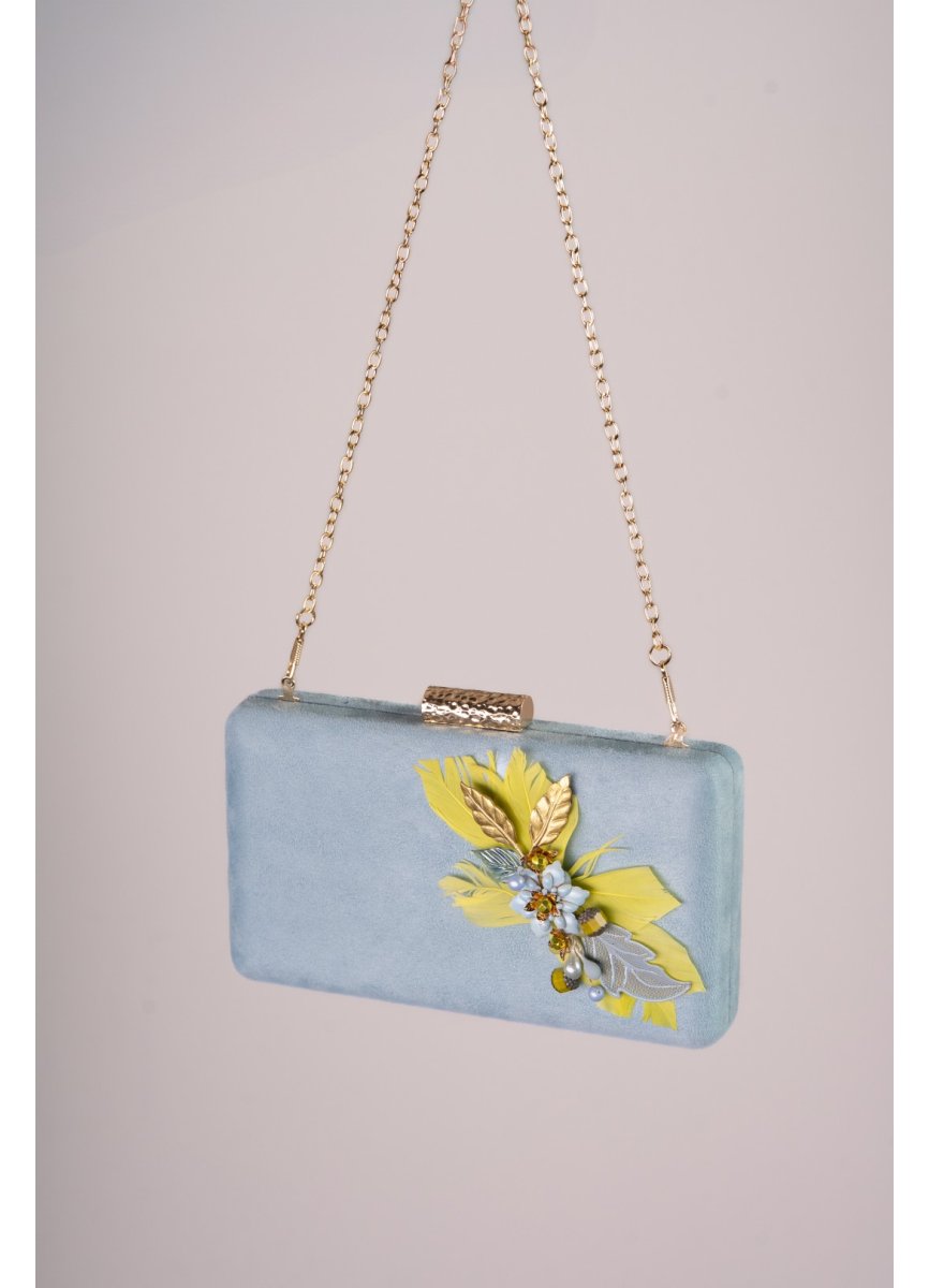 Light blue rectangular bag with gold closure. Ornament with central enameled flower and metal leaves on the sides, balls and pistils. For the lime green touch duck feathers. Measurement 20cm. X11cm. X3, 5cm. Approx.