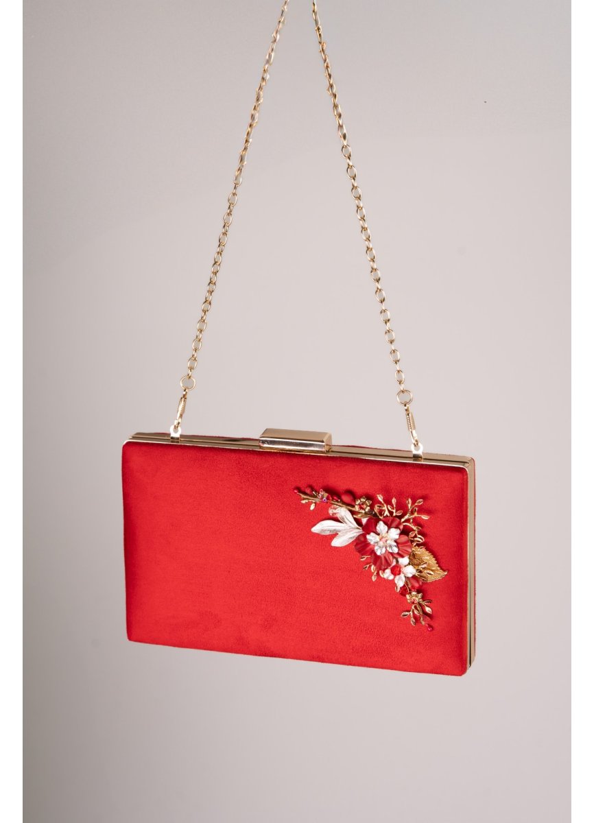 Rectangular bag in red tone and gold closure. Ornament in the upper corner with a porcelain and pearlescent flower with sprigs of metal leaves, balls and pistils in red. Measurement 20cm. X12cm. x 3.5cm. Approx.